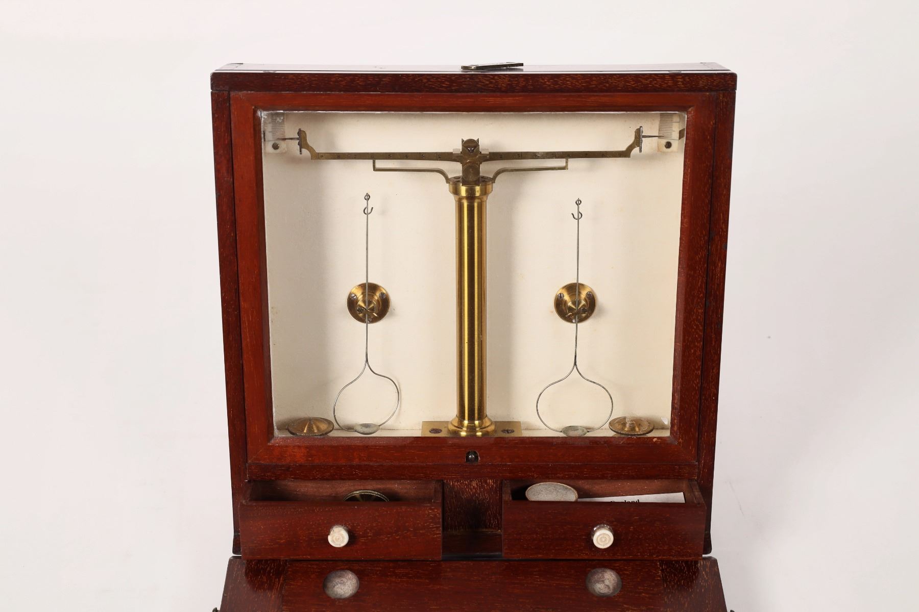Beautiful hardwood cased balance scale. Measures 2.5"x 9"x 9" and has some slight blemishes on wood. A very elegant piece. Please see photos for more details.