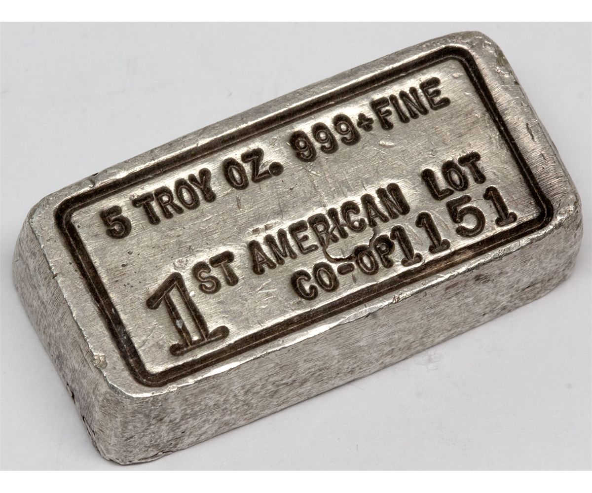 4.95 Troy oz, .999+ fine. According to the consignor, "1st American CO-OP is a successor to the Bear Paw Mining Company ingots produced in the early 1900's….one paper I have read timelines it as follows; Bear Paw Mining company in business from 1895 to 1903; inactive for 17 years and reopened in 1920 as 1st American CO-OP; then CS Consolidated Silver late 1920's."City: Bear PawCounty: State: MTDate: c1920
