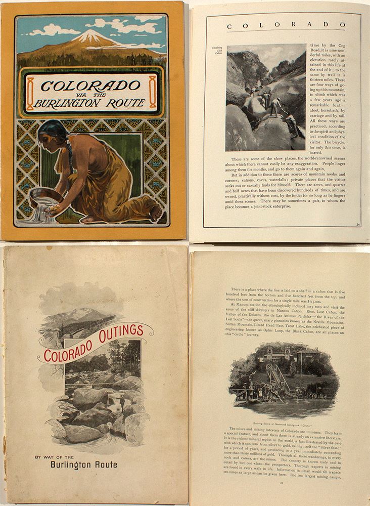 1)" Colorado Outings" by way of the Burlington Route. Copyright 1898. 48 pages. 6" x 8 1/2 " Pictures and foldout map. Some wear.