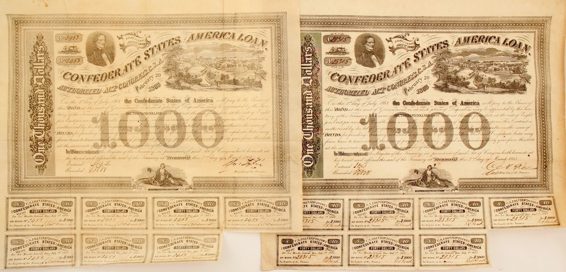 1863 #2453 $1000, 1 coupon missing, rough condition. 1863 #28315 $1000, 1 coupon missing, rough condition. Date: 1 City: State: HWAC# 76807