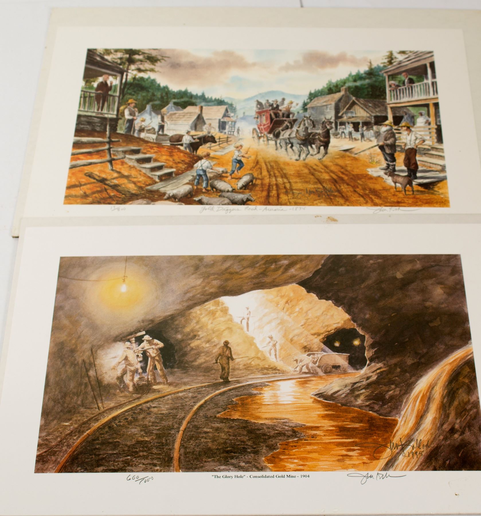 2 color lithographs, 13" x 19" Gold Digger's Road in Auraria with an action image of a stagecoach full of men coming down a road, #13/300. The Glory Hole at Consolidated Mine 1904 with underground miners drilling and at work. #660/1000. Both are signed by artist John Kollock.