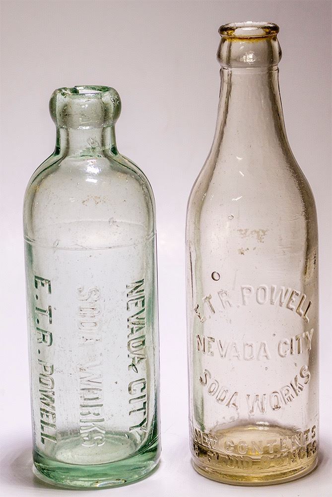 1 lime green pint, NEVADA CITY / SODA WORKS / E.T. R. POWELL with large lip chip. Clear pint E.T. R. POWELL / NEVADA CITY / SODA WORKS / NET CONTENTS / 8 FLUID OUNCES. No visible cracks or chips except as noted. City: Nevada City State: California Date: HWAC# 51045