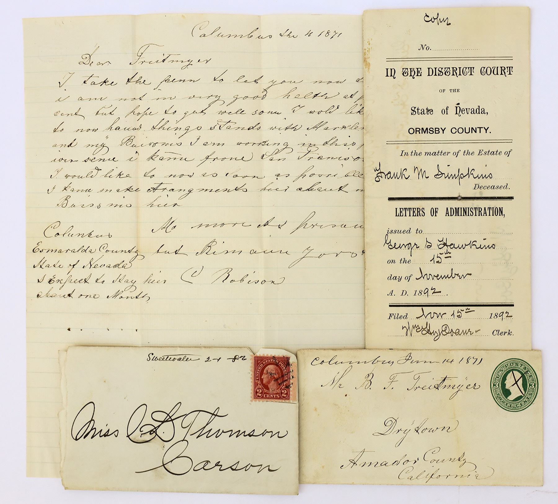 Both contain contents. 1) Earliest Sweetwater postmark with ties to 'The Rocket' on Mono Lake. 1882. Only known Sweetwater manuscript cancel (Gamett & Nelson). Rarity-4. Includes Letter of Administration for Mr. Simpkins. Letter addressed to Mr. George Hawkins. Extensive biographies of Clara Thomson (soon to be Mrs. Hawkins) and George Hawkins. Both come from early Nevada settlers. George was an apprentice in the V& T Railroad shops in Carson City, ran 'The Rocket' on Mono Lake for two years, worked at the Standard Mill in Bodie, and dug artesian wells in the Carson City area. 2) Columbus Manuscript cancel on cover with post office business. 1890. Rarity-5. Biography of addressee JHB Harris - a postmaster indicted for 'unlawfully and knowing deliver obscene mail'. He is also in trouble as the cover states that he has been 'absent 1 week'. No postmark or cancel on the2c green stamp, so it must have been official business.