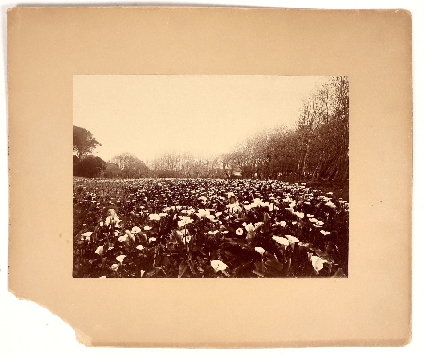 An adorable photo of two little girls posed in a field of calla lilies, possibly sisters. This image was likely taken in Capetown, South Africa c1890-1900. Photo measures 8"x7", mounted to a sturdy 13"x11" backing piece. A corner approximately 2"x1.5" is missing from the backing. See photo.
