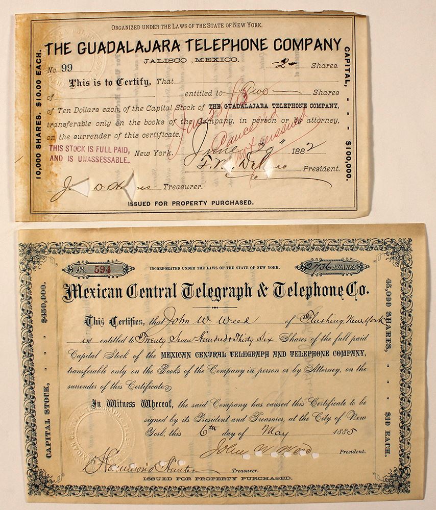 Group of two, both organized under the laws of New York. 1) The Guadalajara Telephone Company, No. 99, 2 shares issued on June 20, 1882. Datelined Jalisco, cancelled by red pen and hole punch. 2) Mexican Central Telegraph and Telephone Co., No. 594, issued for 2736 shares to John W. Weed on May 6, 1885. Cancelled by hole punch.