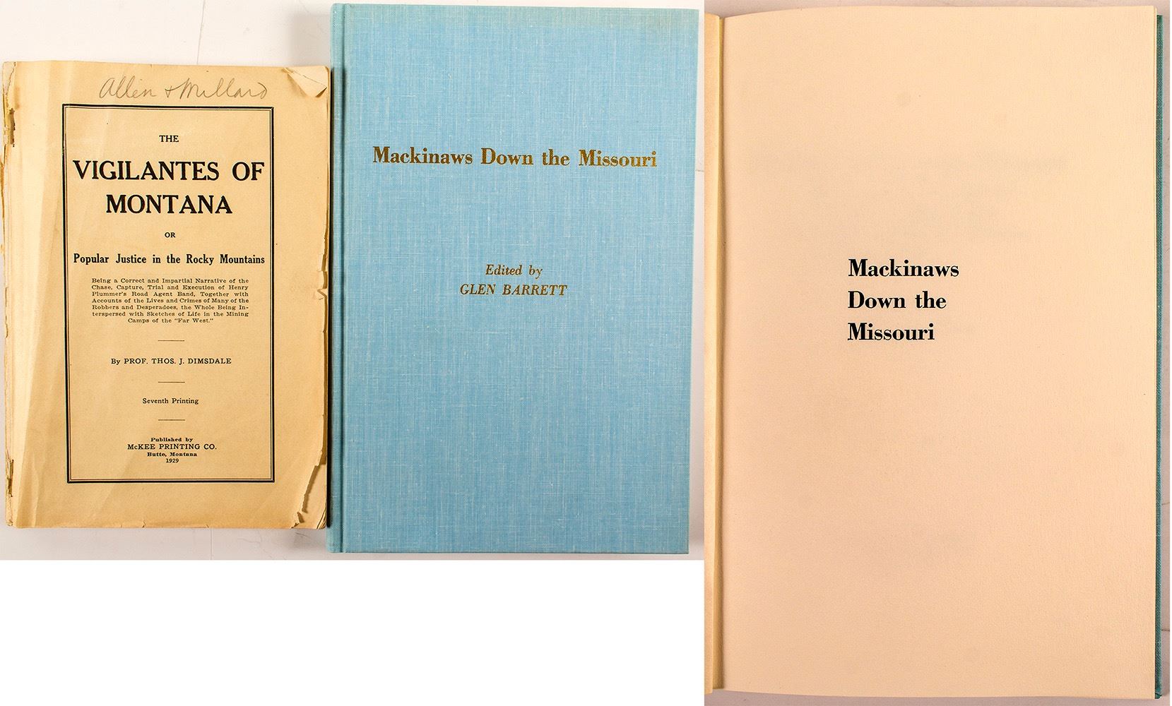 Vigilantes of Montana or Popular Justice in the Rocky Mountains by Prof. Thos. J. Dismdale. Mackinaws Down the Missouri by Glen Barrett. HWAC# 50520 Date: Location: Montana