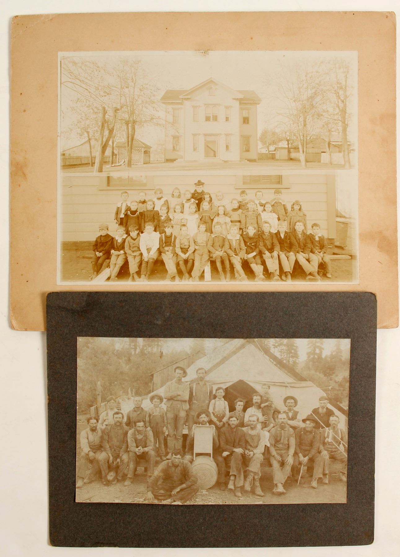 2 b/w. approx 5 x 7" miners? and family in front of a tent. 5.5 x 8.5" teacher and class in front of a school. City: Sierra County State: California Date: c1900 HWAC# 81546