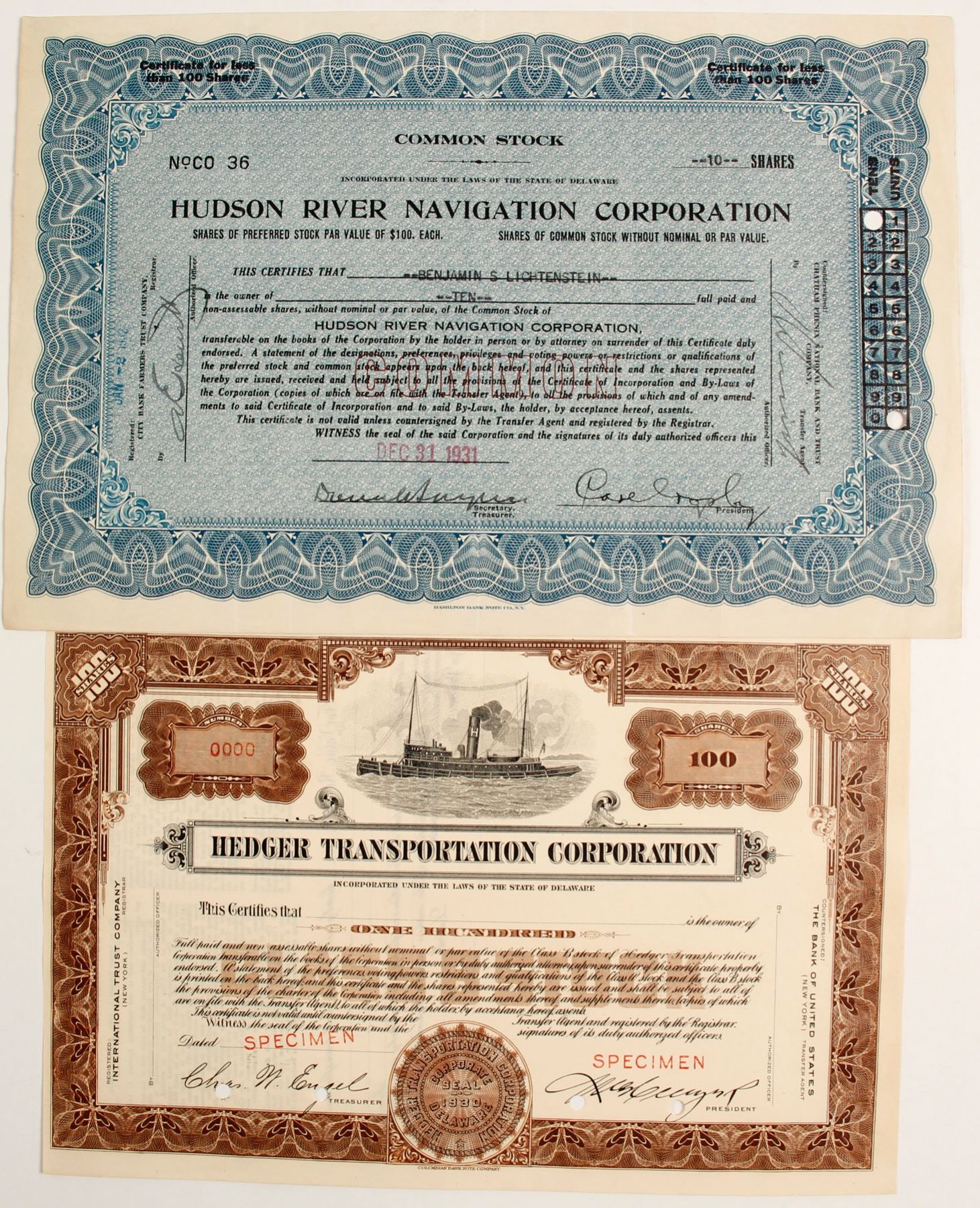Specimen #0000 hedger Tramsportation Corp with tug vignette. I/U Hudson River Havigation Corp #36 Benjamin Lictenstein 10 shares 1931 signed by President illegible. Prag Collection. State: New York City: Date: HWAC# 83432