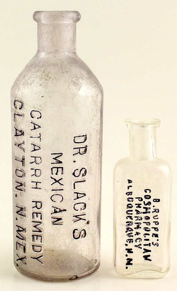 2 nice New Mexico drug bottles. Slack's Mexican Catarrh Remedy from Clayton, New Mexico, minor stain otherwise mint. Rupee's Cosmopolitan Pharmacy, Albuquerque with crack in side. 3 1/2 inches tall. City: State: New Mexico Inventory Number: 38909