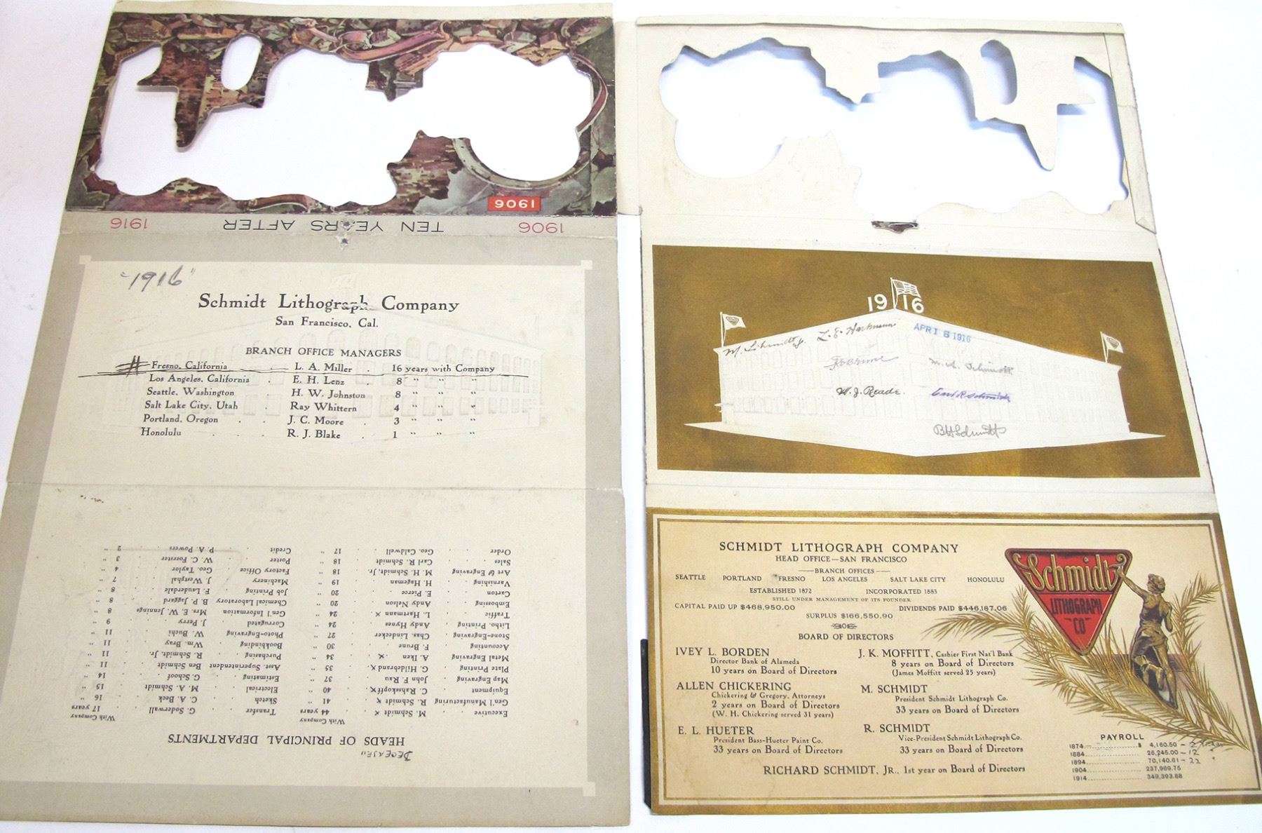 Schmidt Litho was one of the best and most colorful of the San Francisco printers. Here are 2 of there company directories, 1 has signatures of 7 company employees.The fronts have diecut SF earthquake ruins 10 years after the actual quake. Date: 1916 Location: San Francisco, California HWAC# 54655