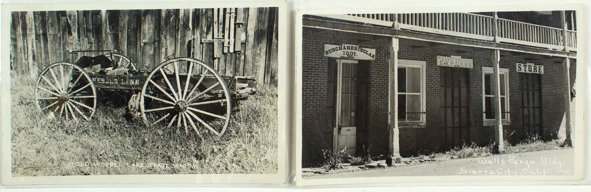 RPC's--1) Wells Fargo Bldg., Sierra city, Calif. 2) Old Webber Lake Stage Wagon. Back of card reads: "Pioneer Sierra Resort, Dating from 1860's". (Prag Collection) City: Sierra City State: California Date: ID# 30724