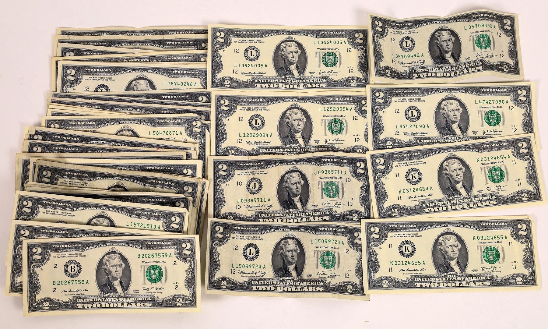 Lot of 51 $2 bills Series 1976 or later. F-CU condition.