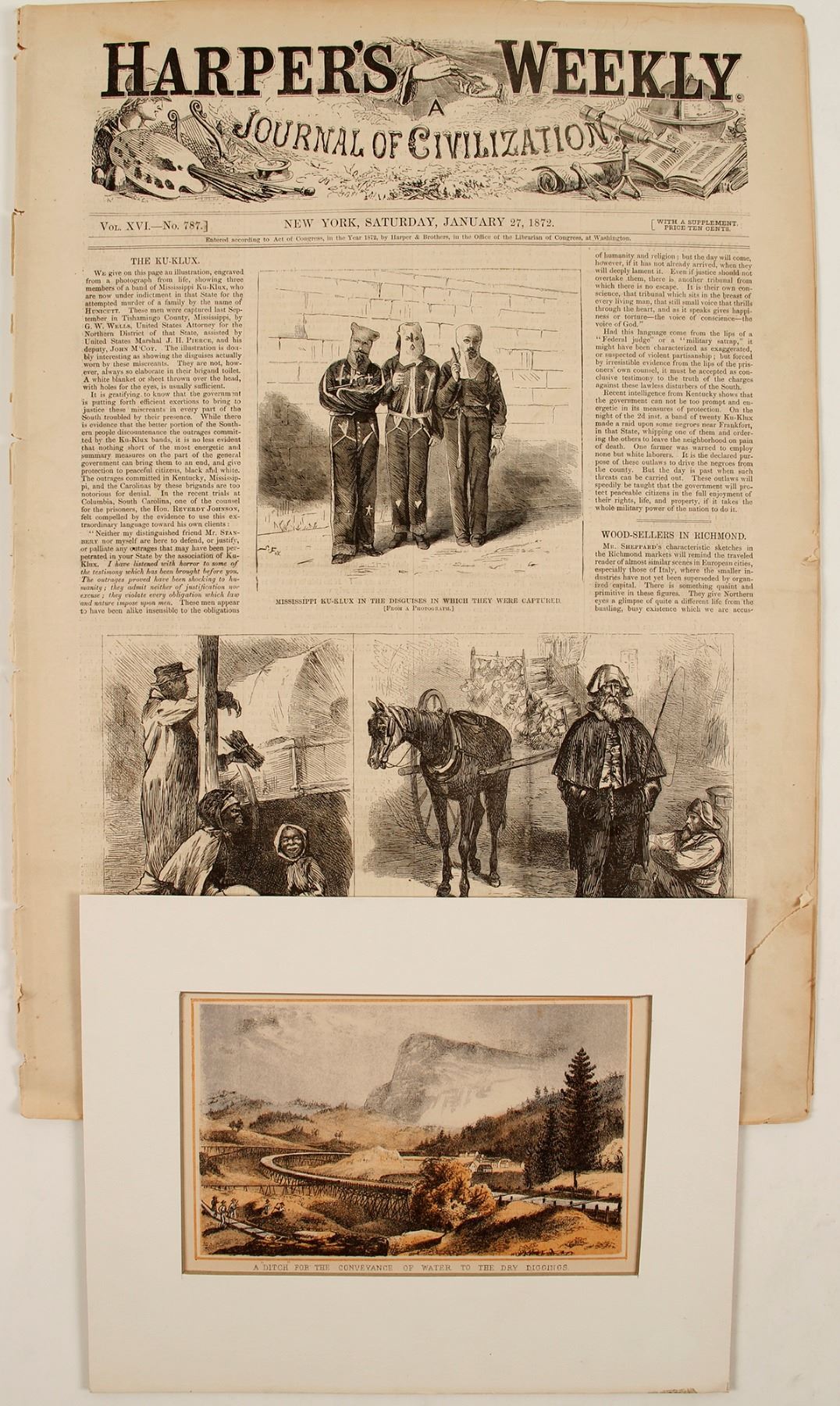 4" x 6.5" matte multi color Gold Rush lithograph? titled "A DITCH FOR THE CONVEYANCE OF WATER IN THE DRY DIGGINGS", possibly South Fork of American River near Strawberry, CA. Harper's Weekley, January 27, 1872pp 73-88. Features 3 captured KKK men in outfits, 2 page article on Mormons and more. Tears on bottom of front page.