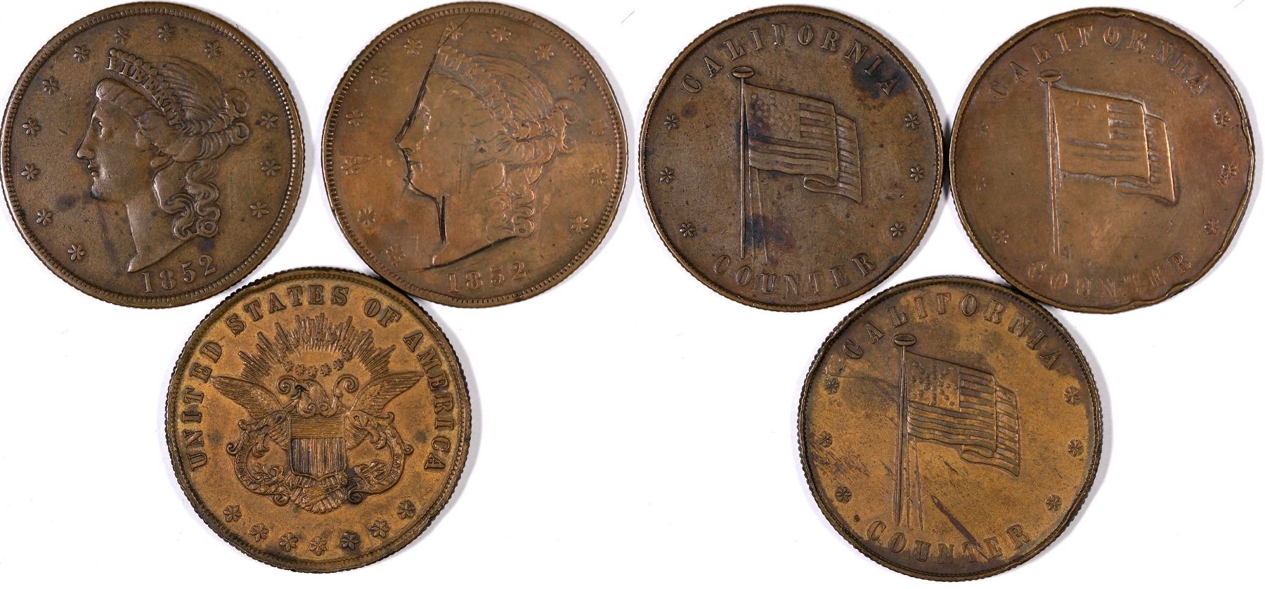 Lot of three California counters $20 U.S. gold piece size with three different flag reverses; two Liberty head obverses and one eagle obverse.