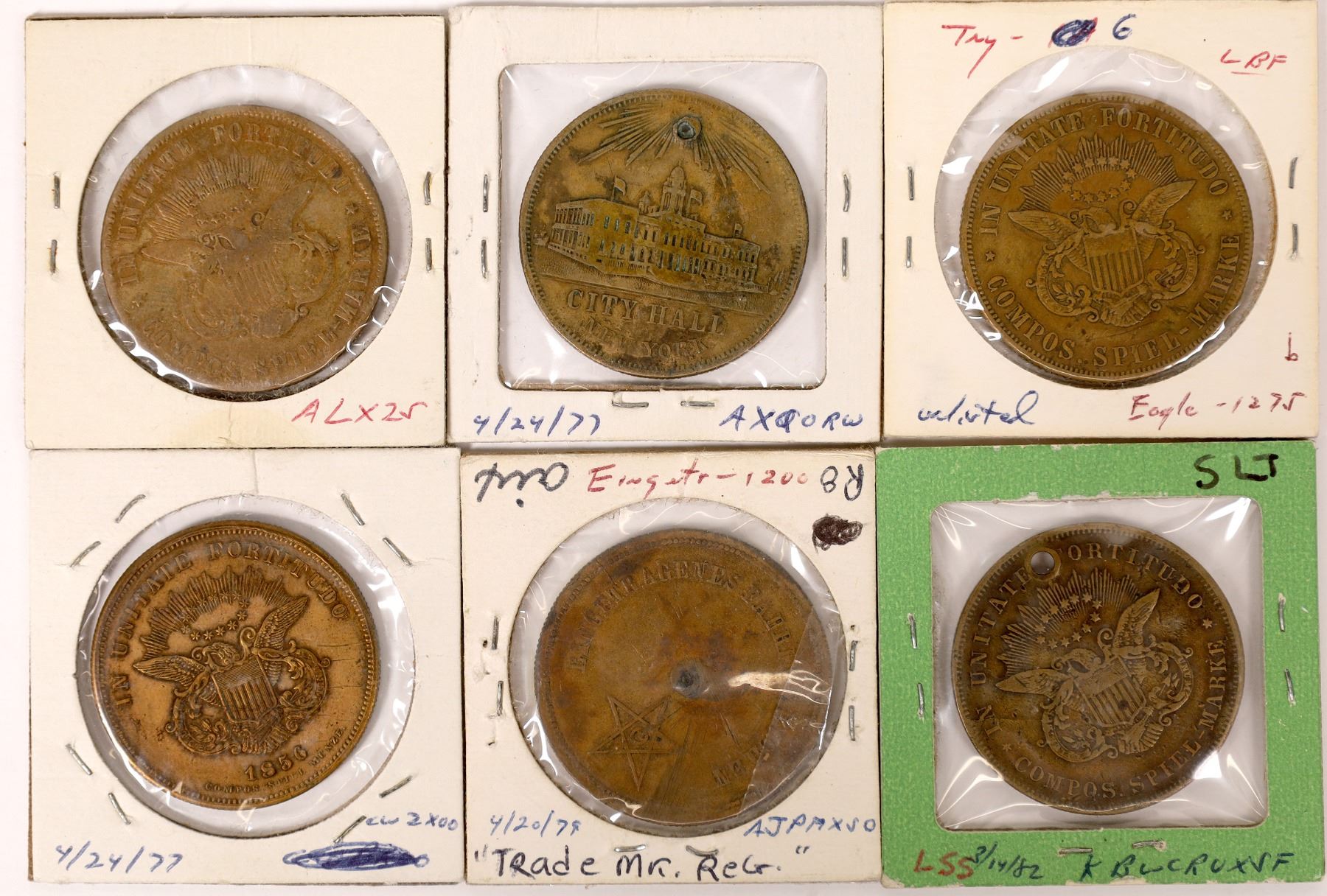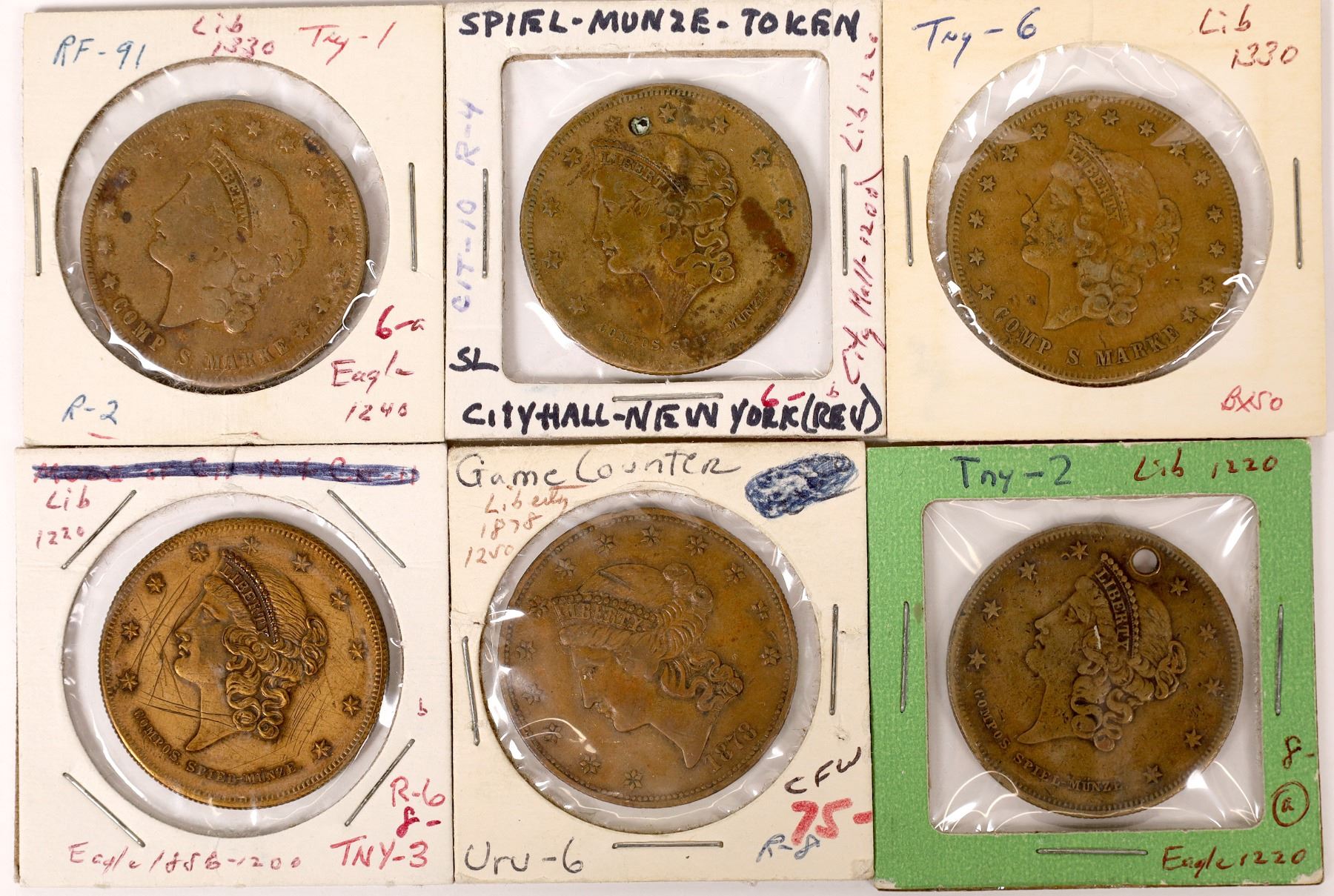 Lot of six $20 U.S. gold piece spiel markes. Obverse die varieties: Liberty head 1220 (3); 1330 (2) and one dated 1878 (1250) Reverse die varieties: city hall, eagle 1275; comp spiel marke (2); star. Two are holed.