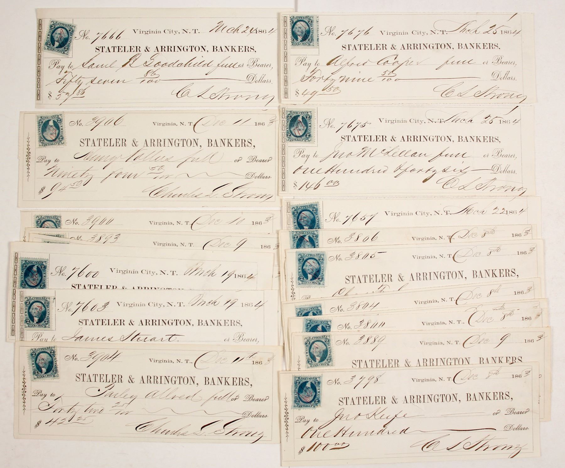 Lot of 20 Stateler & Arrington checks signed by Charles Strong as superintendent for the Gould & Curry Silver Mining Company. All are Virginia, N.T. 1863-64 datelines. All cut cancelled but in clean condition. Strong was in charge of the Gould & Curry Mine and oversaw the development of a grand 40 stamp mill at the intersection of Six Mile and Seven Mile Canyons for close to a $1 million dollars in 1863.