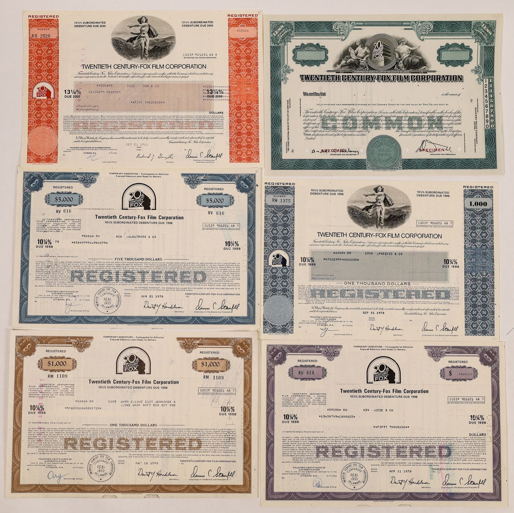 A half dozen beautiful stock certificates issued by Twentieth Century Fox Film Corporation in 1978-1981. Fox was responsible for Shirley Temple's rise to world prominence. They also produced films like The Planet of the Apes and Star Wars franchises and were the developers of the Cinemascope process. These are in good shape. Please see photos for more detail and condition.