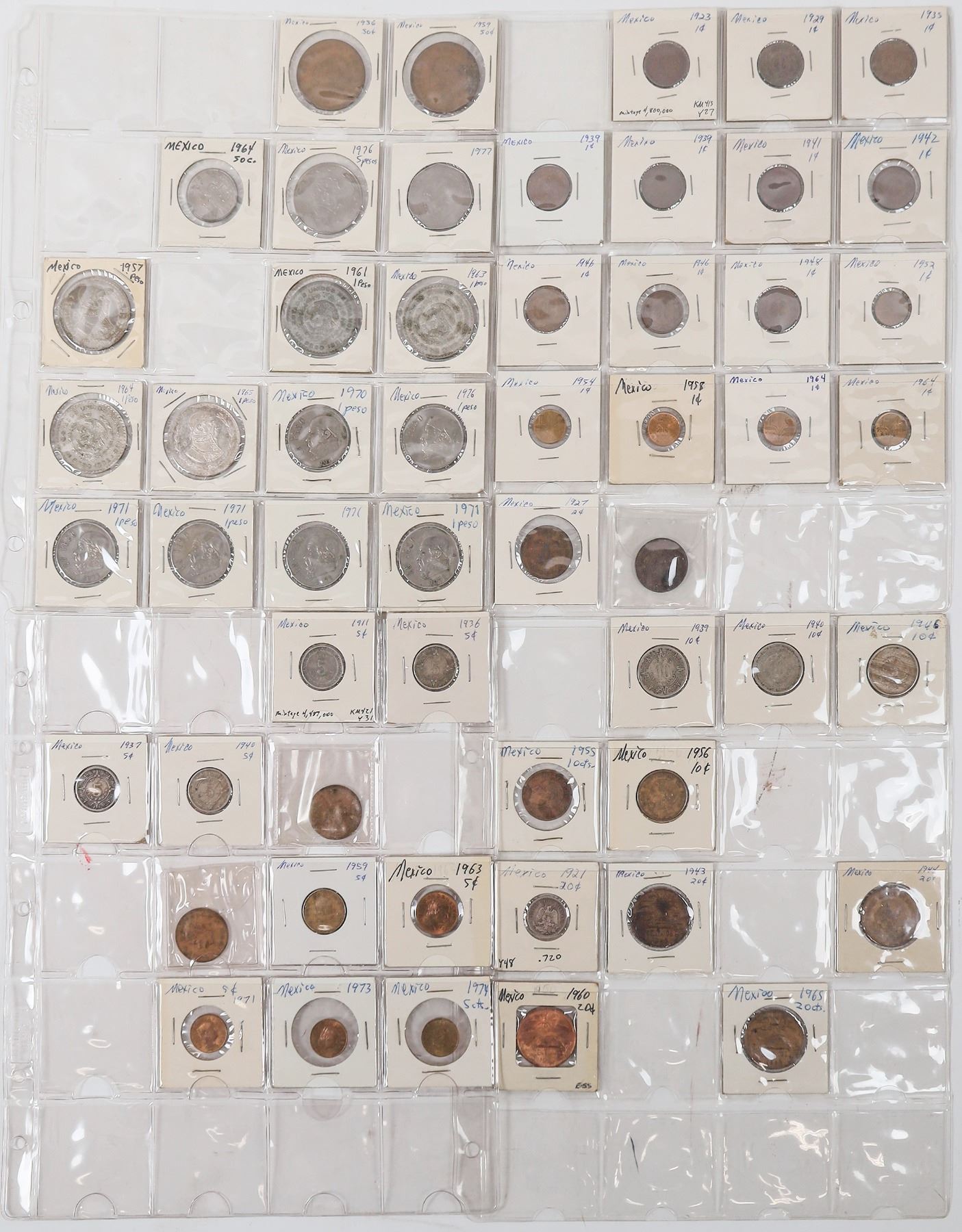 Lot of 54 coins of Mexico. One centavo (15) 1923-1964); Two centavo (2) 1927, 1941; five centavo (10), 1911-1974; ten centavo (4), 1939-1956; Twenty centavo (5) 1921-1965; Fifty centavo (3); 1976 five pesos; 1977 ten pesos; eleven one peso (1957-1976).