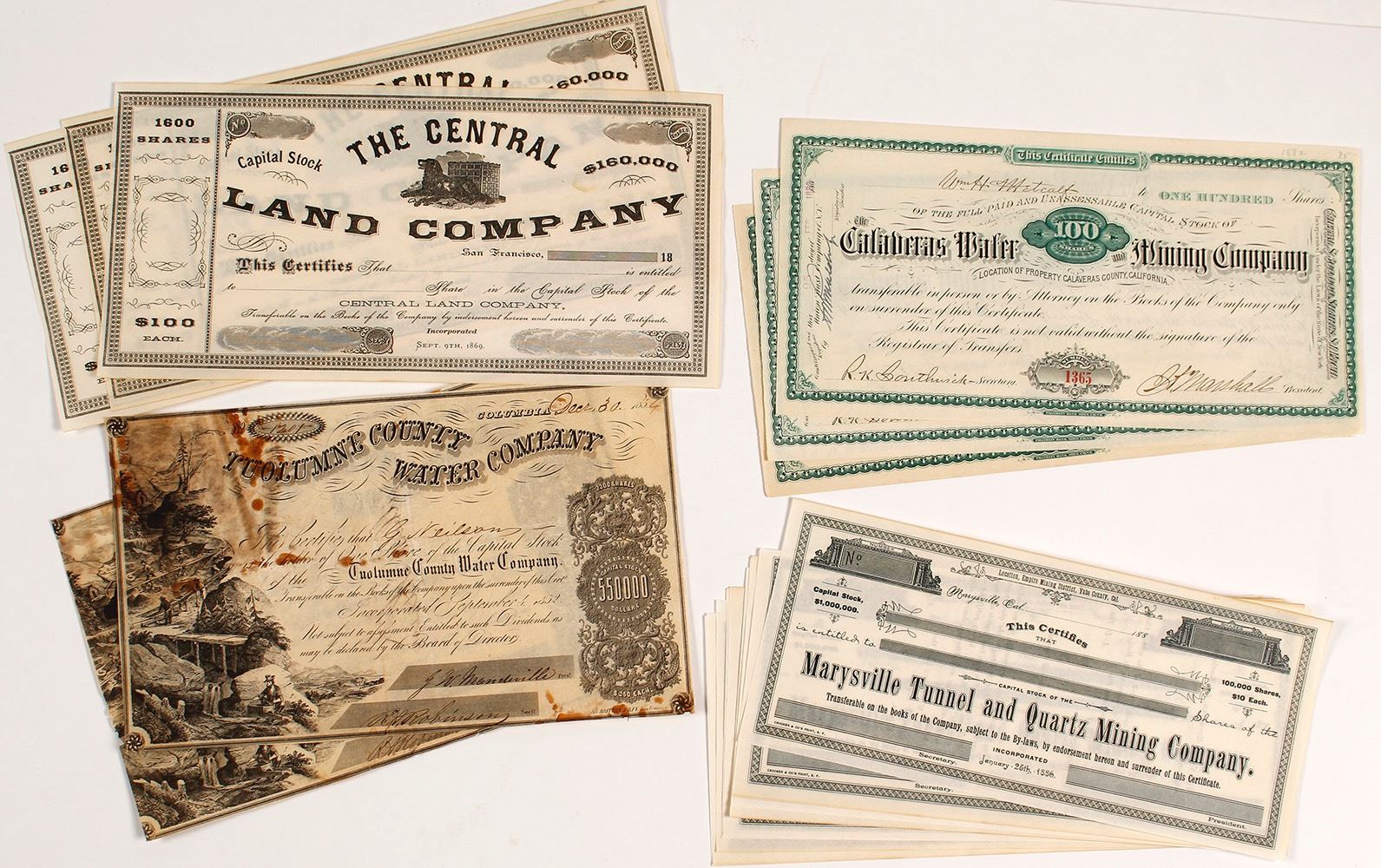 1) Two Tuolumne County Water Company issued stocks, 1854, highly pictorial. Punch cancelled and heavy staining. 2) Thirteen unissued Marysville Tunnel & Quartz Mining Co. stocks, c.1880s. 3) Three issued (1882) Calaveras Water and Mining Company stocks, none cancelled. 4) Three unissued Central Land Company stocks, San Francisco, c.19th century. (Prag Collection) Date: Location: California HWAC # 55634