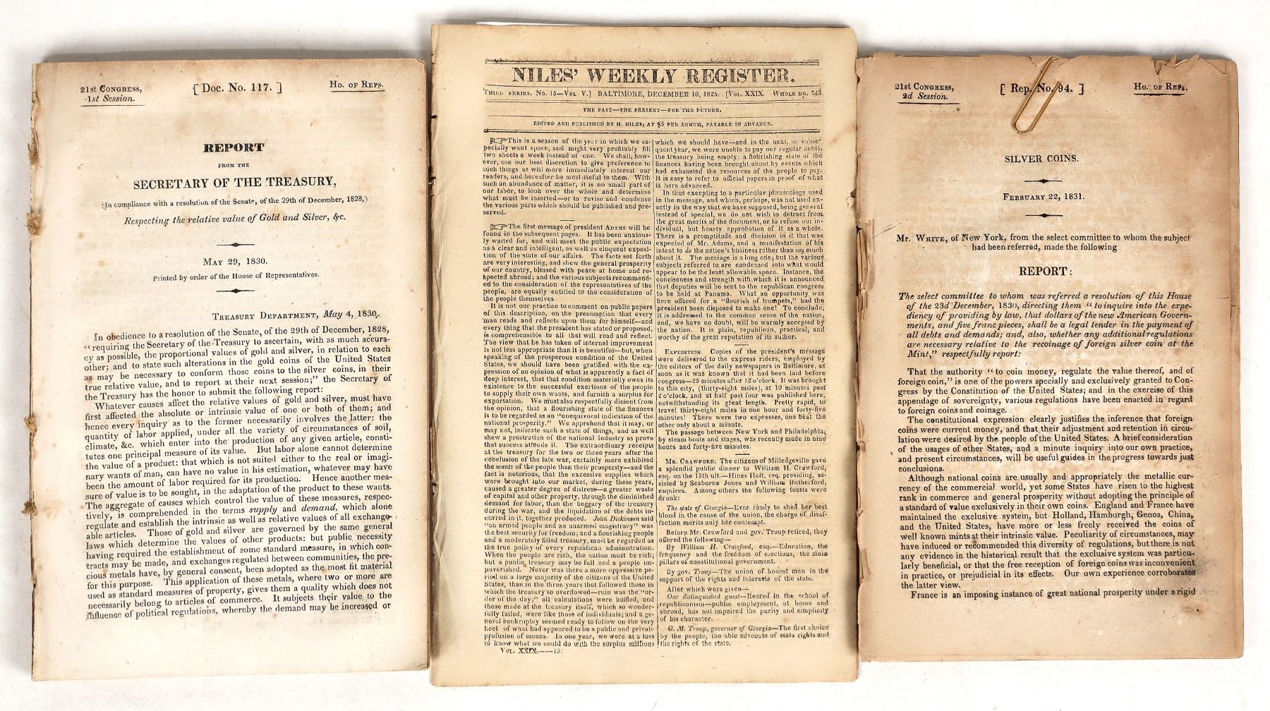Congressional report dated February 22, 1831 discussing foreign coinage used in the United States (Spanish dollars and five franc coins), and dollars of the new American Government, as legal tender. Second session of the 21st Congress. 118 pages, 5 x 9 inches; no cover, loose binding. Also Niles' Weekly Register dated December 10, 1825, a Baltimore publication discussing the new half dollar. About 16 pages, 5 x 9 inches, no cover.