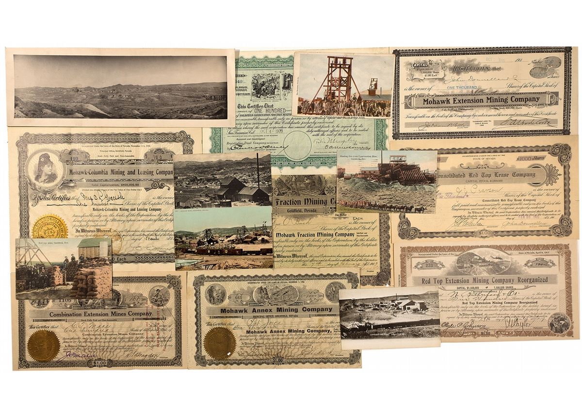 Lot of 12 postcards, eight stocks, one letter, and one photograph. Postcards: Two rps. One blank one used. Both show birds-eye views of the combination mine in black and white. Three chromolitho cards with no borders. One shows a horse-drawn carriage at the Combination Mine hauling ore, another shows a view of the Mohawk Mine, and the last shows miners at the Red Top Mine. Two are used and one is not. Four chromolitho cards with borders. All four are used. One shows an aerial view of the Combination Mine, another shows a landscape view of the Mohawk Mine, the third has miners gathered at a mine shaft at the Mohawk Mine, and the last shows the Mohawk Mines and a train. One real photo post card with a border. Postcard is used. Image shows a black and white picture of the Mohawk Mine from an aerial perspective. Two linen cards. One is used, one is not. Both show the Combination Mine. One has a black and white image of a miner dumping ore, and the other shows a landscape view of the mine from a distance. Stocks: 1) Red Top Extension Mining Company Reorganized. Incorporated in Nevada in 1917. Certificate No. 233 issued on July 27, 1917 to N. Rutherford & Co. for 500 shares. Signed by assistant secretary Clyde P. Johnson and president P. W. Taylor. Two vignettes: one at the top center of the mill and one at the bottom right corner of three miners inspecting ore. Brown border. Gilded and embossed seal. Stock is U/C. Printer - A. Carsisle & Co. Certificate measures 9.75"x5.5". 2) Consolidated Red Top Lease Company; Incorporated in Nevada. Certificate No. 2765 issued on February 20, 1909 to J. E. Pearson for 1000 shares. Signed by secretary J. Robertson and vice president John Dounsllan. No vignettes. Black border. Embossed seal in bottom left corner. U/C. Printed by The W. H. Kistler Stationary Co. Certificate measures 10.25"x5.5". 3) Mohawk Extension Mining Company; Incorporated in Arizona in 1906. Certificate No. 250 issued on October 9, 1906 to John Dounsllan for 1000 shares. Signed by secretary Jordan B. Cottle and president J. A[illegible]. No vignettes. Black border. Embossed stock on the bottom left. Stock U/C. Printed by Crocker Co. Measures 10"x5.5". 4) Mohawk Annex Mining Company. Incorporated in Nevada in 1906. Certificate No. 661 issued on Jan 12, 1907 to Pat Joice for 1000 shares. Signed by secretary E. J. Sweetland and vice president J. B. Hedrick. Three vignettes along the top. Black border. Gilded seal and safety print. U/C. Printed by Goes. Measures 9.75"x5.5". 5) Mohawk Fraction Mining Company; Incorporated in Arizona in 1906. Certificate No. 497 issued on February 7, 1907 to [illegible] O. Bush for 400 shares. Signed by secretary H. M. F[illegible] and president M[illegible]. One vignette in top center of miners working below ground. Black border. Green safety print and green embossed seal. U/C. Printer uspecified. Measures 11"x8.5". 6) Mohawk=Columbia Mining and Leasing Company; Incorporated in Nevada in 1906. Certificate No. 110 issued on March 11, 1907 to Ms. C. P. Graessle for 100 shares. Signed by secretary Walter A. P[illegible] and president C. C. M[illegible]. Two allegorical vignettes at top left and bottom center. Black border. Gilded and embossed seal and gilded safety print. U/C. Measures 11"x8". 7) Combination Extension Mines Company; Incorporated in Arizona in 1906. Certificate No. 1106 issued on April 12, 1907 to C. J. Mace for 100 shares. Signed by secretary J. Mitchell and vice president N. J. Bragdon. Three vignettes along the top of miners. Border is black. Safety print is gilded. Seal is gilded and embossed. U/C. Combination Fraction Mining Company; Incorporated in South Dakota. Certificate No. C2040 issued on October 4, 1909 to I. Herzberg for 100 shares. Signed by assistant secretary illegible, secretary O[illegible], and vice president T. W. M[illegible]. One vignette of miners at the top left. Border and safety print is green. Seal is embossed. Stock is not cancelled. Printer unspecified