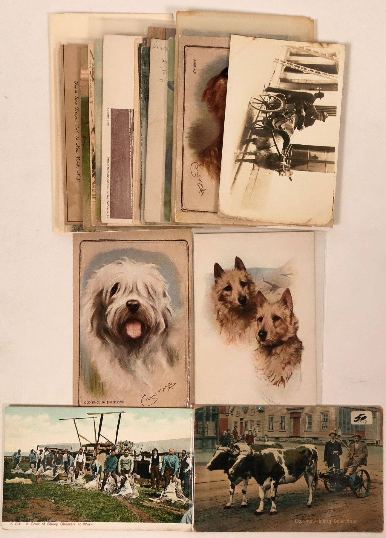 Nice grouping of horses, horseteams, dogs and cats with some real photos thrown in. Includes a Tuck card from Louis Wain titled, "At The Cat Show", Series I, #9540, and also two cards signed by Ernest H. Mills.