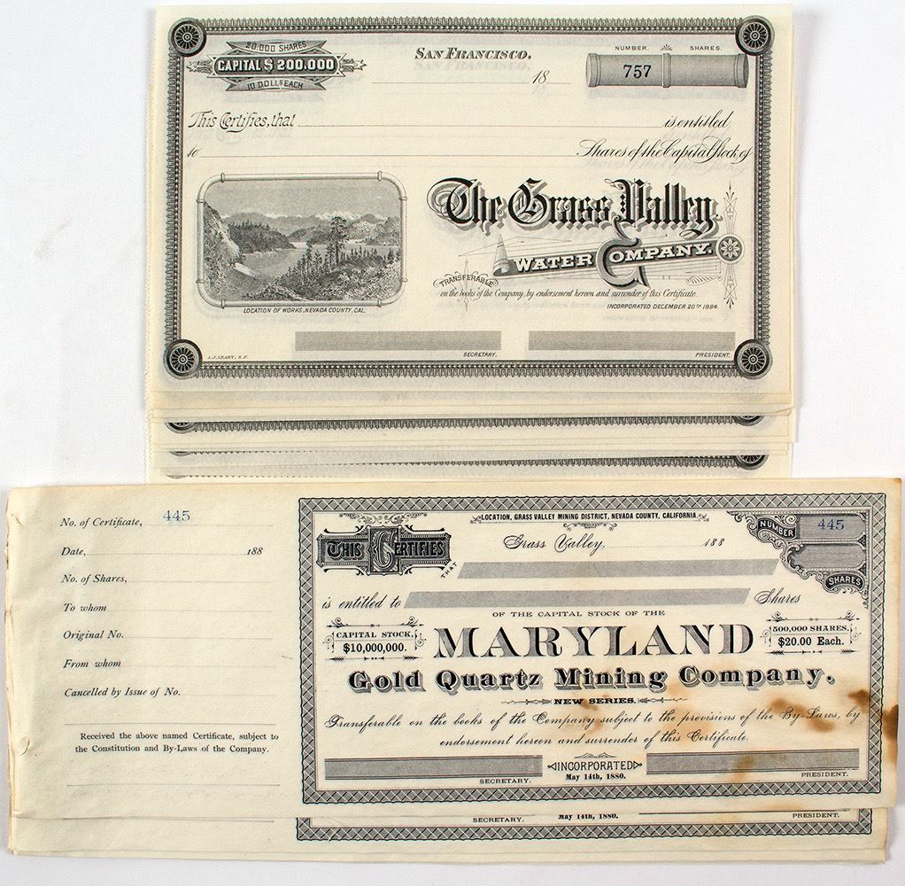 Two different companies. 1) Gold Quartz Mining Co. unissued c. 1880's 14 certs, 8 with stains. 2) Grass Valley Water Co. unissued 9 certs Date: Location: Grass Valley, California HWAC # 54413