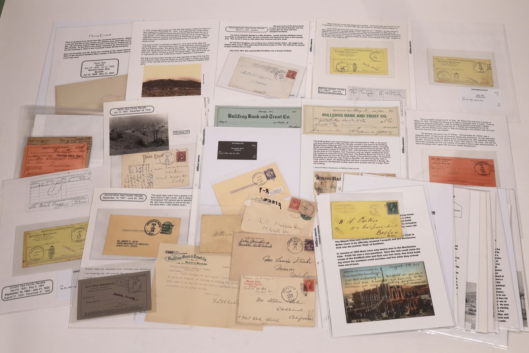 Includes an R-9 Manse cut piece, Belmont R-5, Broken Hills, R-5 Tybo, R-5 1870’s Ione City and an R-5 Butler with a corner advertising for the Mizpah Club of Tonopah. Also, Jackass Flat, Pahrump, Sunnyside, Earliest Round Mountain postmark (Gamett & Nelson), Rhyolite Bullfrog Bank & Trust with check, Hot Creek, Pioneer, etc. 20 different locations. City:Nye County Group State:Nevada Date: