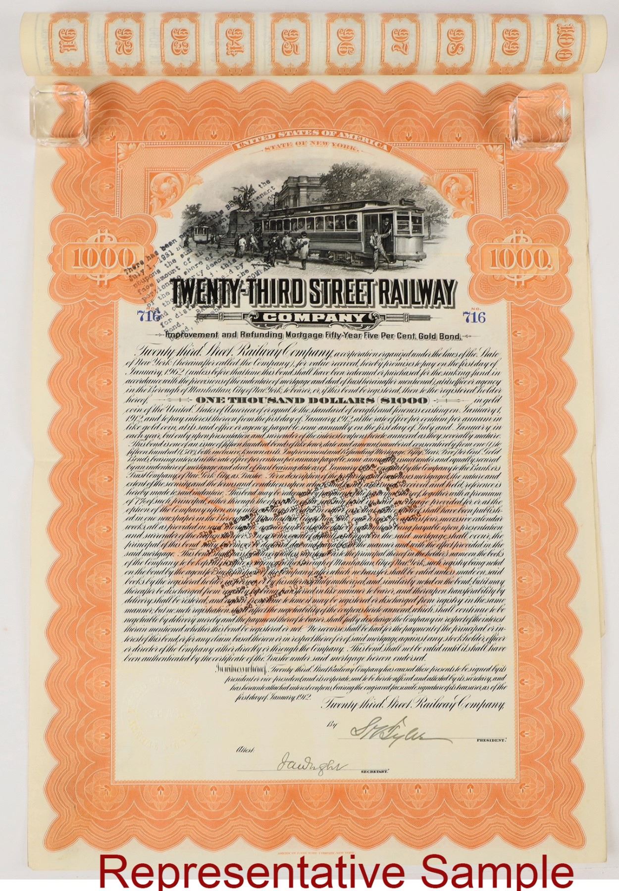 23rd Street Railway $1000 Gold Bonds. c1912. About 220 bonds.