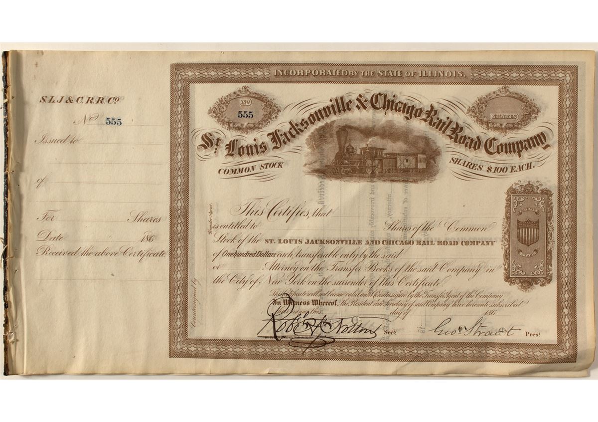 Lot of 24 signed, but unissued certificates. Light brown color. Incorporated in the State of Illinois. Vignette of train at upper center. Signed by Geo. Straut as president and Robert H. Nolton as secretary. Punch cancel through signatures. Most are still attached to the remnant spine of the ledger. Some wrinkles and toning (and folds to outer certificates), but most are in nice condition!