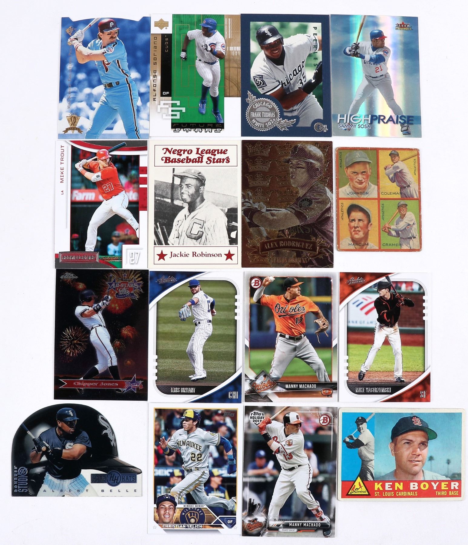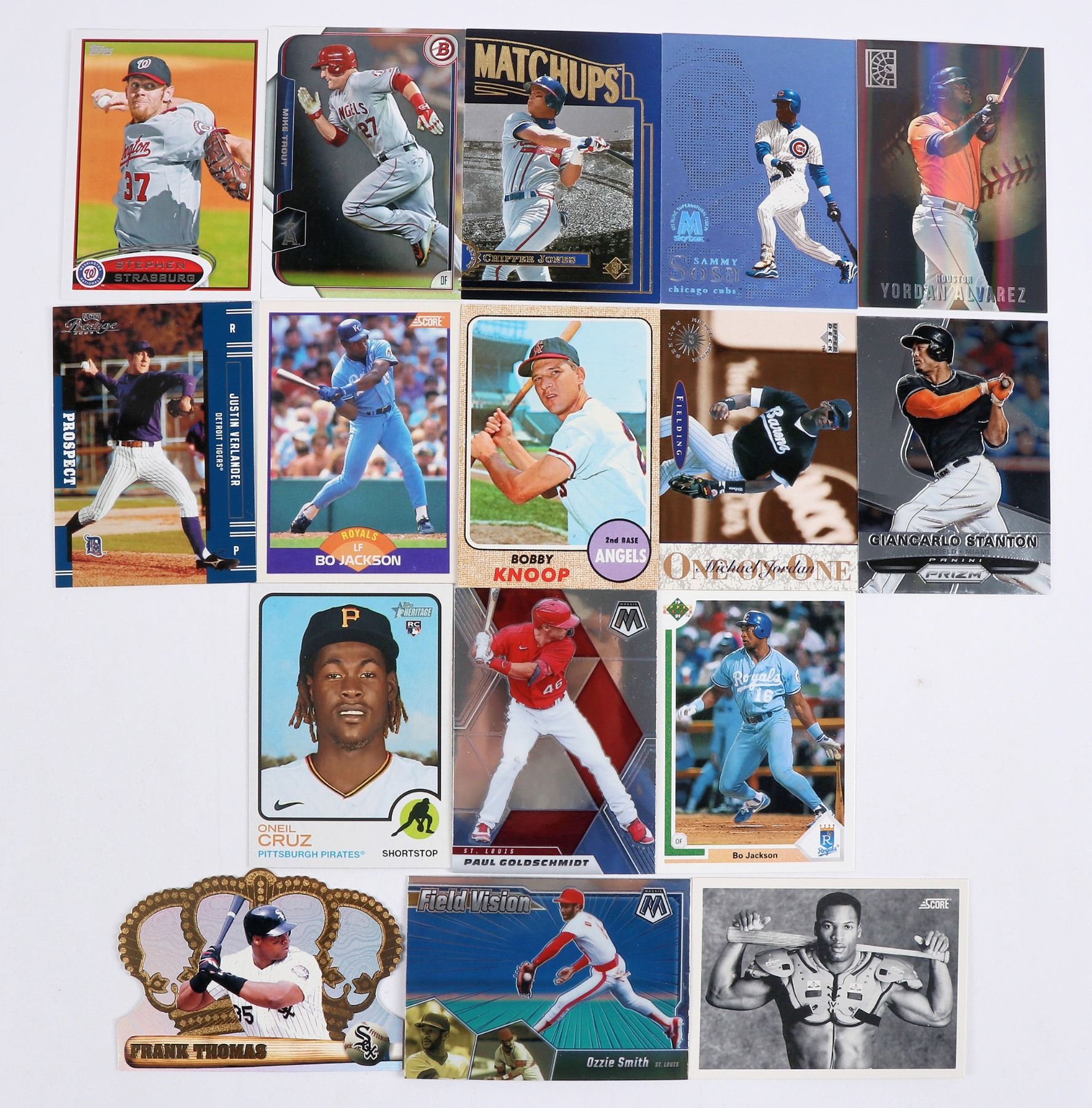 Features, Stephen Strasburg, Mike Trout, Justin Verlander prospect, Bo Jackson, 1968 Bobby Knoop, Frank Thomas cut card, 3 Michael Jordan, Oneil Cruz rookie, Yorden Alvarez, Alfonso Soriano future star, Jackie Robinson, Alex Rodriguez, Frank Thomas baseball hat card, Kris Bryant, Manny Machado, 1960 Ken Boyer, 1935 Goudey 4-in-1 Athletics card, etc.
