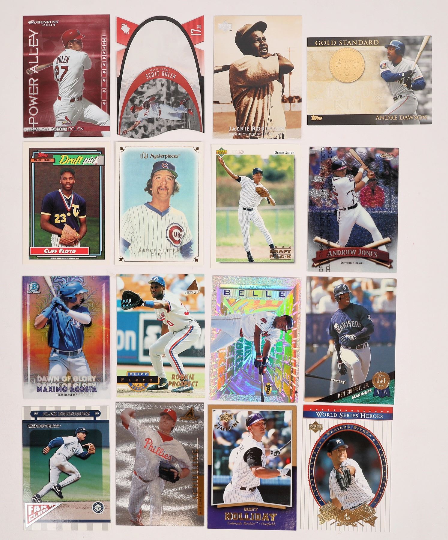 Includes Mike Piazza, Nomar Garciaparra, Robin Yount, Dennis Eckersley, Curt Schilling, Ichiro, Ryan Sandberg, Adam Dunn rookie, Derek Jeter, Frank Thomas, Tony Gwynn, Ken Griffey Jr., Mike Piazza, 1971 Cecil Cooper, etc. See both photos for some of the nicer cards. 250 +/- cards. Includes mostly well-known players, Hall of Fame inductees or future inductees, everyday players, and rookies and minor leaguers (some of which blossomed; most fizzled). Many insert cards! Randomly selected. Mostly 1980's and later. Older cards are peppered in and an occasional 1950's card appears. Who knows what treasure might be hidden in this collection? Great buy at 10c a card as start price!