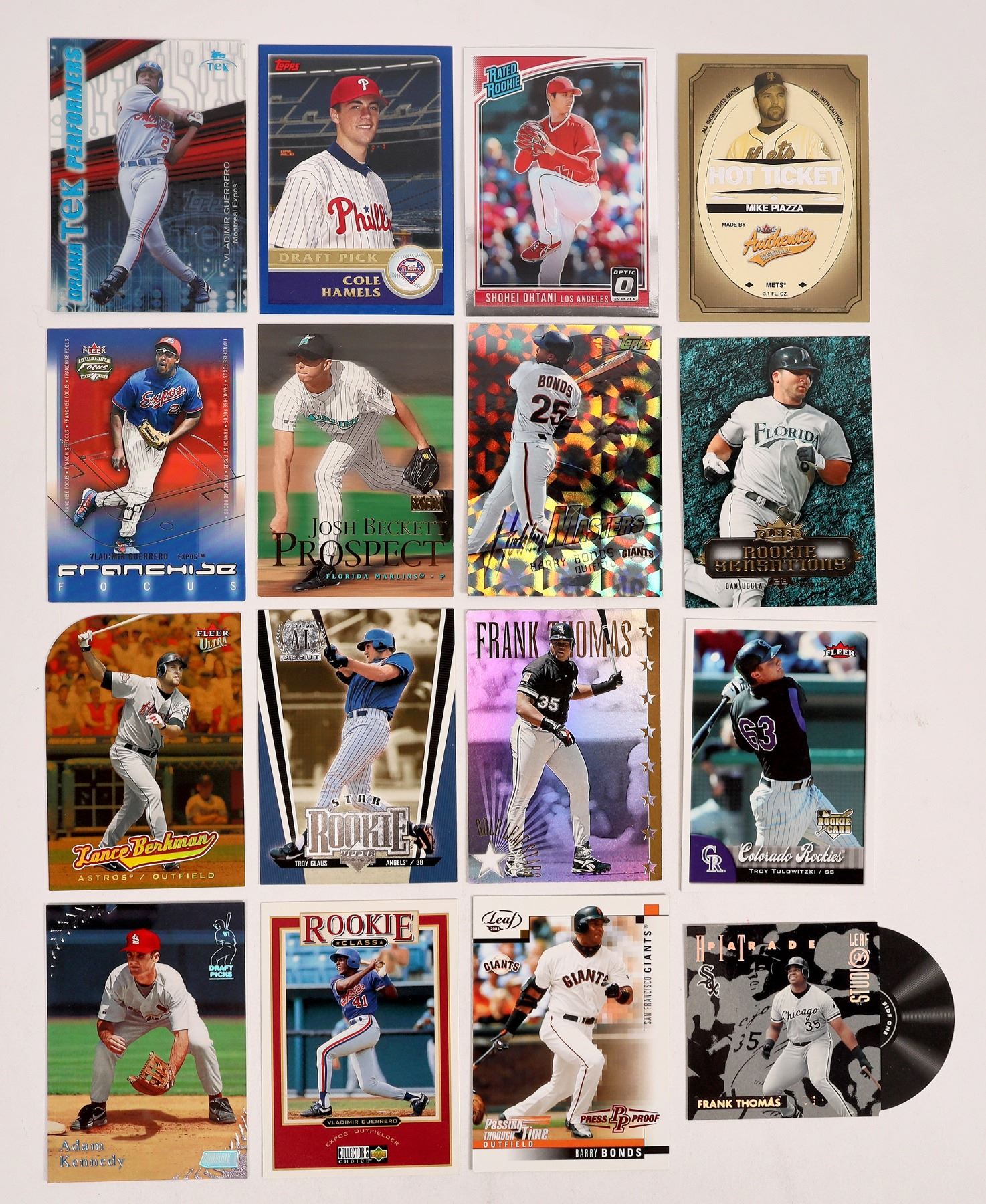 Includes Shohei Ohtani rated rookie, Adam Kennedy rookie, Cole Hamels draft pick, Josh Beckett prospect, Troy Glaus star rookie, Vladamir Guerrero rookie, Dan Uggla rookie sensation, Troy Tulowittzki rookie, Barry Bonds, Frank Howard, Derrek Lee debut, very early Luis Gonzalez, Alex Freeland 363/499, Cal Ripken Jr., Alex Rodriguez, Dawel Joseph Dominican prospect league, etc. See both photos for some of the nicer cards. 500 +/- cards. Includes mostly well-known players, Hall of Fame inductees or future inductees, everyday players, and rookies/minor leaguers (some of which blossomed; most fizzled). Many insert cards! Randomly selected. Mostly 1980's and later. Older cards are peppered in and an occasional 1950's card appears. Who knows what treasure might be hidden in this collection? Great buy at 10c a card as a start price!