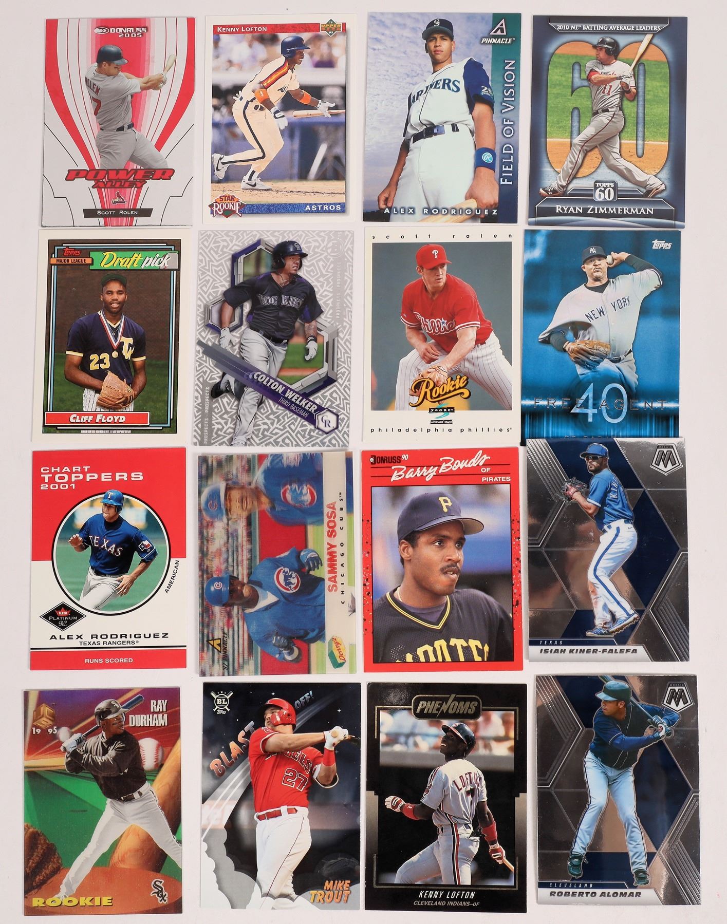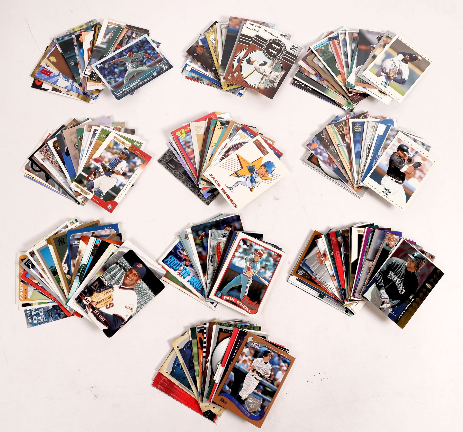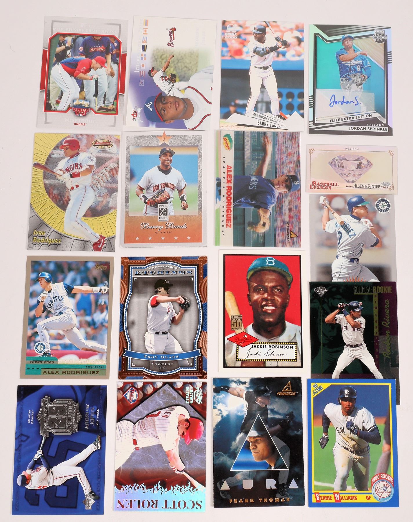 Includes Mike Trout, Ivan and Alex Rodriguez, Barry Bonds, Mariano Rivera, Frank Thomas, Trevor Hoffman, Bernie Williams rookie, Nate Pearson rookie, Ruben Rivera gold leaf rookie, Ken Griffey Jr., Jordan Sprinkle autograph,2000 replica of Topps 1953 Jackie Robinson, etc. See both photos for some of the nicer cards. 250 +/- cards. Includes mostly well-known players, Hall of Fame inductees or future inductees, everyday players, and rookies/minor leaguers (some of which blossomed; most fizzled). Many insert cards! Randomly selected. Mostly 1980's and later. Older cards are peppered in and an occasional 1950's card appears. Who knows what treasure might be hidden in this collection? Great buy at 10c a card as a start price!