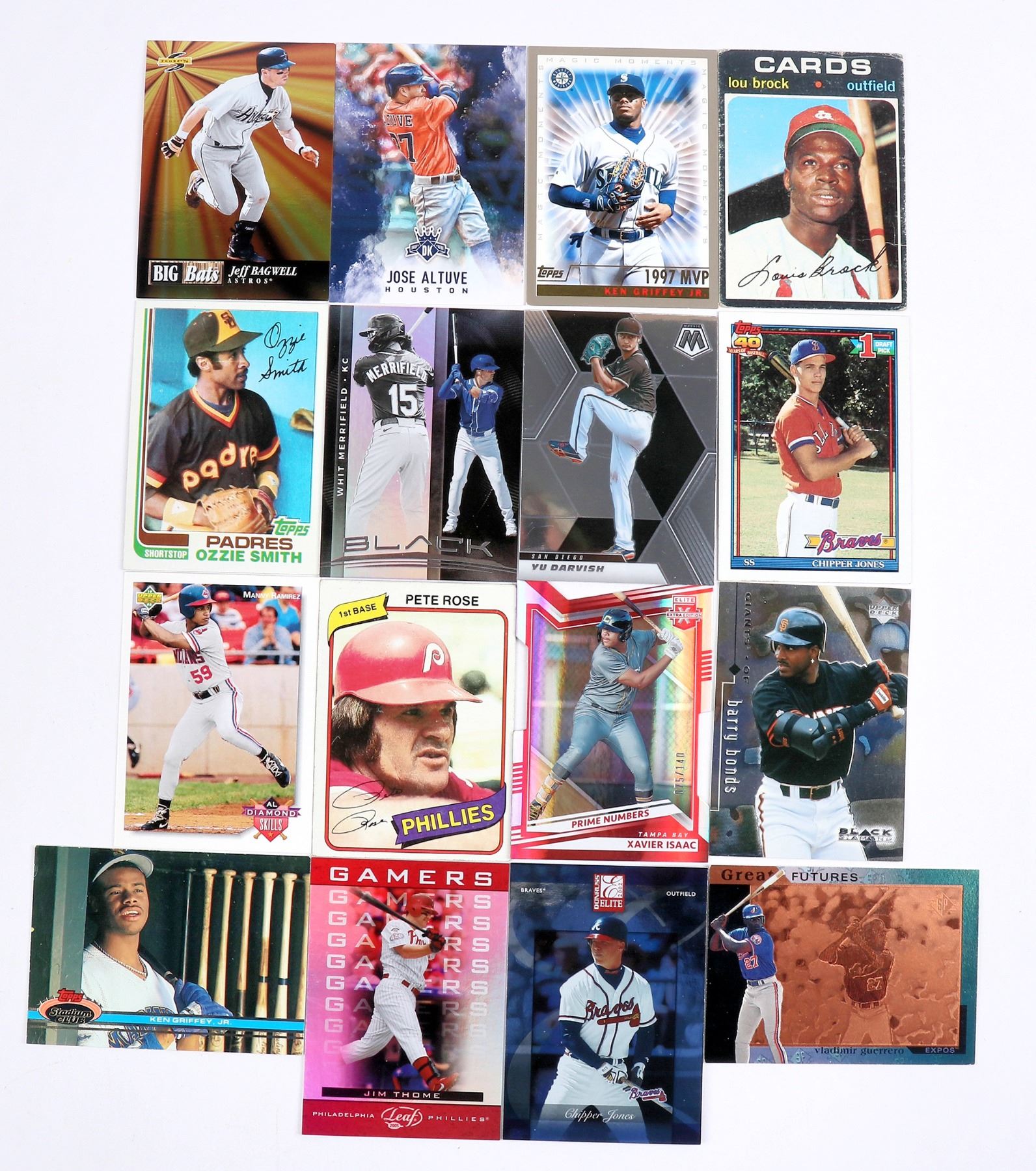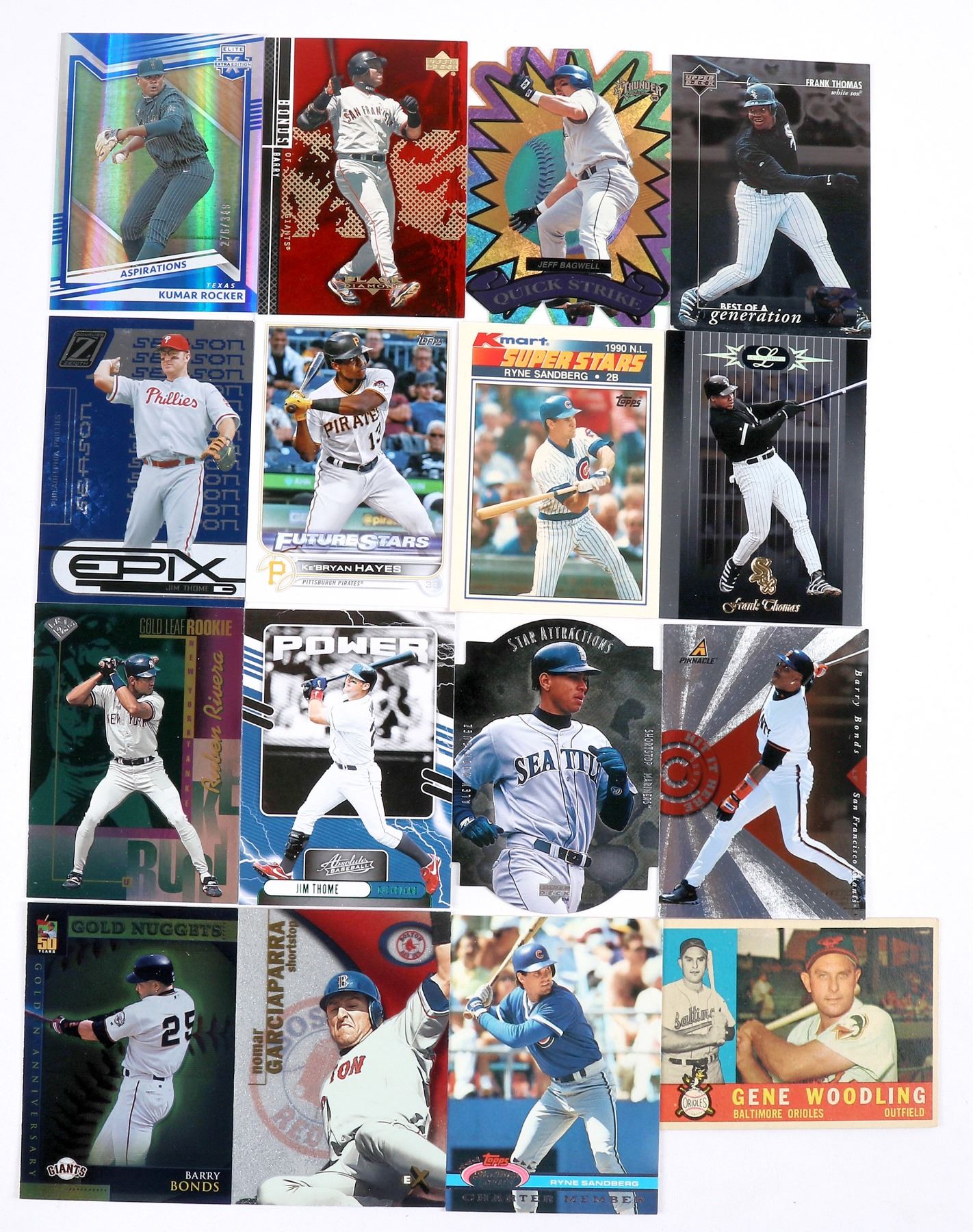 Features Barry Bonds, Jeff Bagwell quick strike, Jim Thome numbered, Le"bryan Hayes, Ryne Sandberg kmart, 1960 Gene Woodling, Alex Rodrigues cut card, Vladimir Guerrero futures, Ken Griggey Jr., Jeff Bagwell big bats, Jose Altuve, 1971 Lou Brock, Manny Ramirez minor league, 1980 Pete Rose, Xavier Isaac numbered, Jim Thome numbered, etc.
