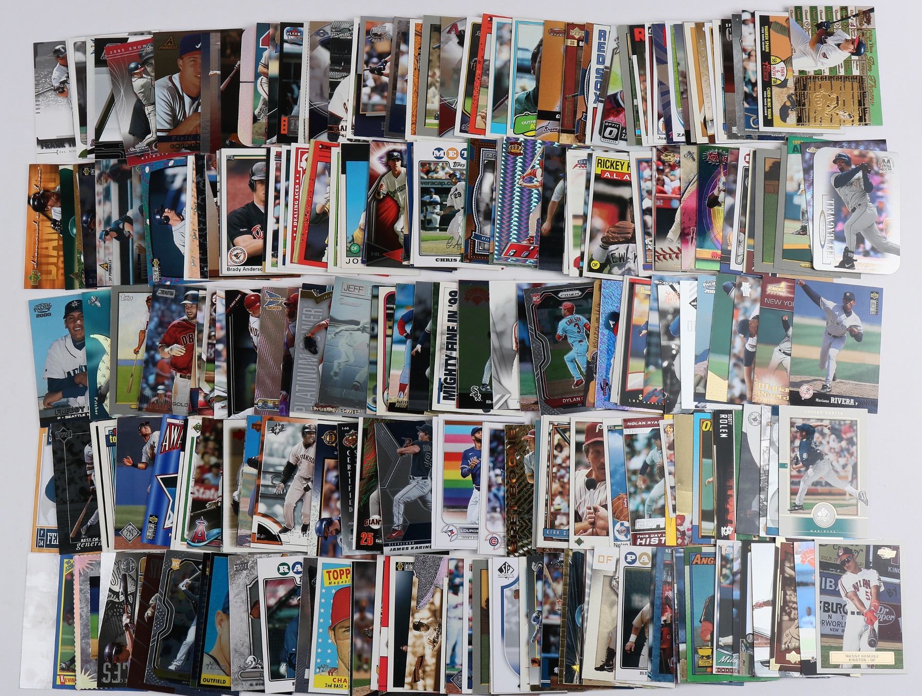 See both photos for some of the nicer cards. 250 +/- cards. Includes mostly well-known players, Hall of Fame inductees or future inductees, everyday players, and rookies/minor leaguers (some of which blossomed; most fizzled). Many insert cards! Randomly selected. Mostly 1980's and later. Older cards are peppered in and an occasional 1950's card appears. Who knows what treasure might be hidden in this collection? Great buy at 10c a card as a start price!