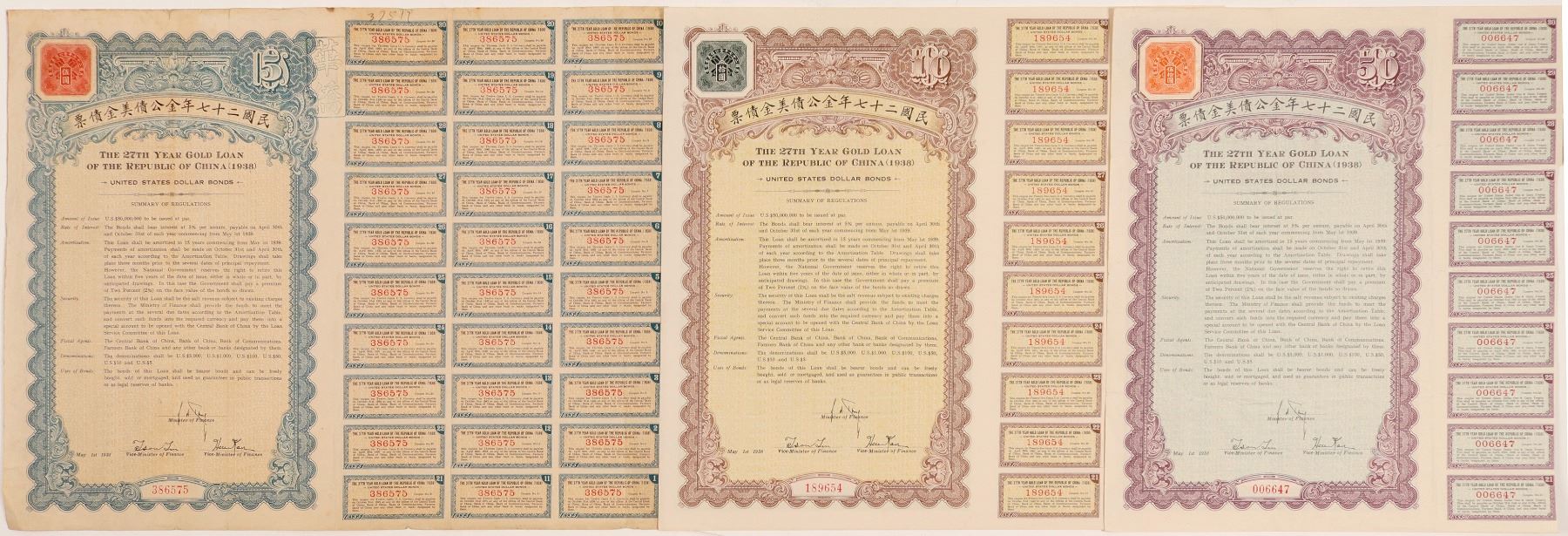 Three denominations of the 27th year gold bonds in US Dollars. $5, $10, $50. Each has a PASCO certificate of authenticity. State: China City: Date: