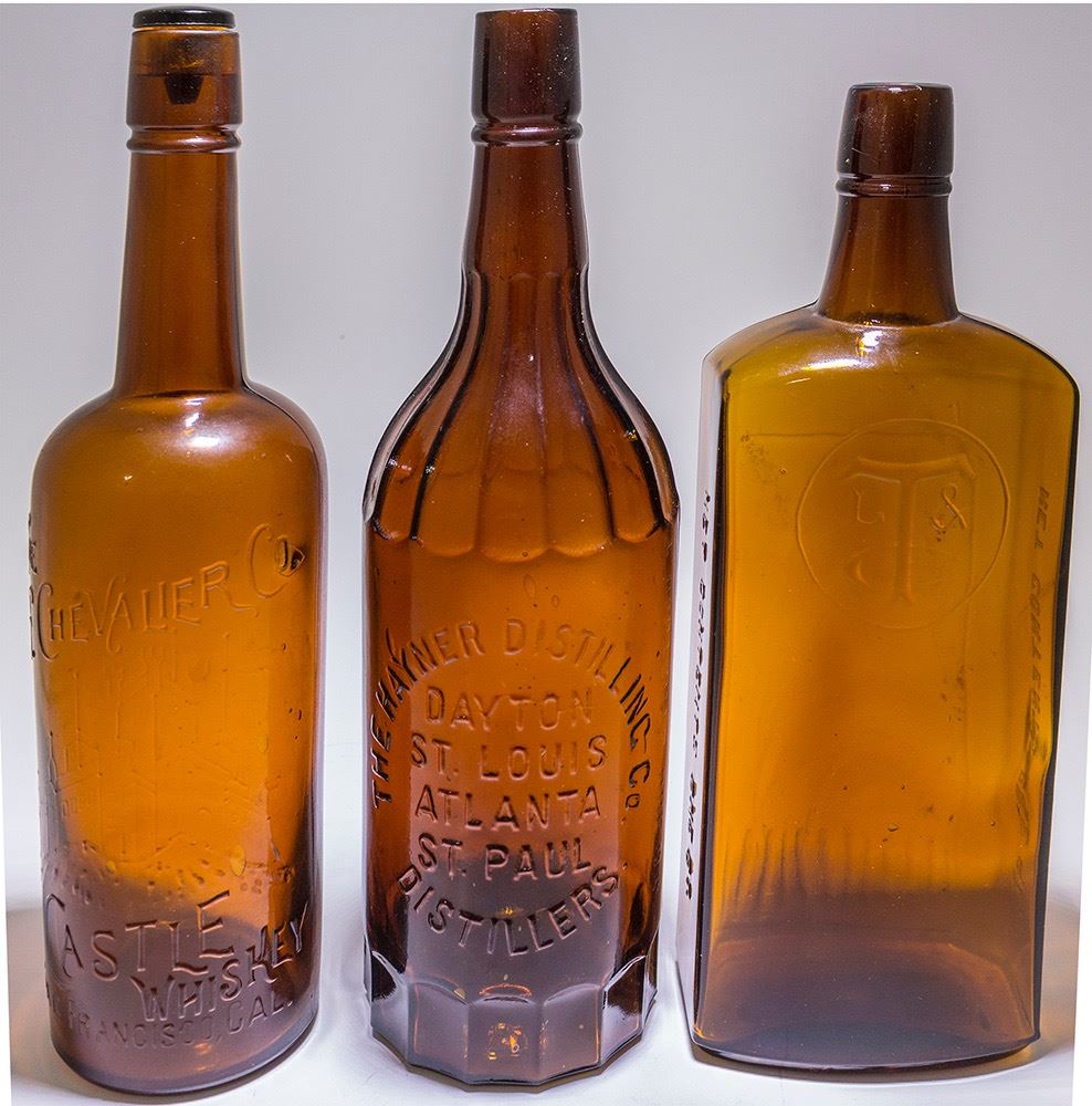 3 Amber Western Whiskies. The E. Chevalier Co., Castle Whiskey, San Francisco, Cal with stopper. Approx 3 x 11.25 inches. No apparent chips or cracks. The Hayner Distilling Co., Dayton, St. Louis, Atlanta, St. Paul Distillers., 1 tiny chip on base. Approx 3.25 x 11 inches. Taussig rectangle, 5 tiny chips. HWAC# 8515 Date: Location: