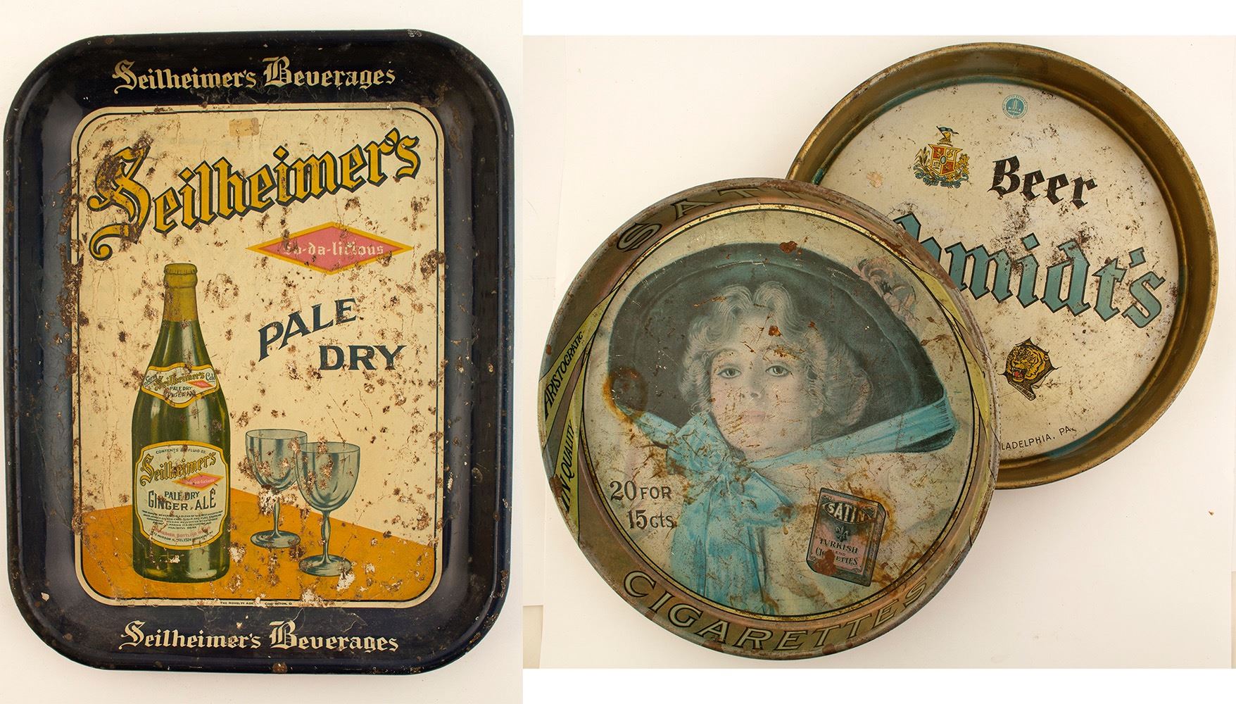 Satin Cigarettes, approx 14 inches, some rust on front. Seilheimer's Pale Dry Ginger Beer, approx 10.5 x 13 inches, moderate rust on front and rear. Schmidt's Beer/Ale. Aprrox 13 inches, some rust on front and rear. Date: Location: HWAC# 48347