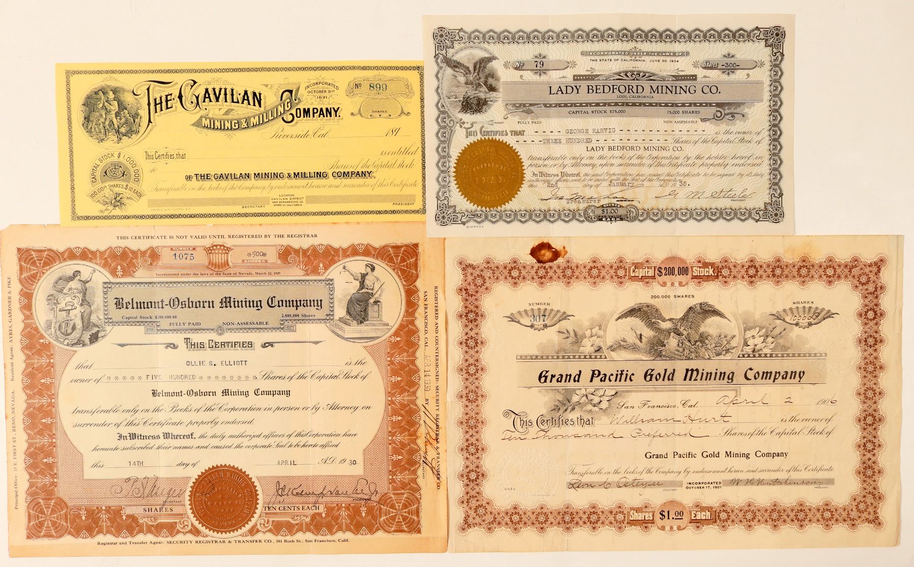 4 mining stock (3 California, 1 Nevada). 1) Unissued Cavilan Mining & Milling Company @ $10 each, cert. #899. Inc. Oct. 31, 1891. Located Gavilan District, San Bernardino, Co. State of CA. Vignette of working miners. Gray border. Printed: Searle & Mclinton, SF. 2) 300 shares @ $1 each of Lady Bedford Mining Co., Lodi, CA. cert. # 79, issued to George Harvig on Jan. 2, 1935. Gray border, vignette of eagle with spread wings on rock over body of water. Gold seal. Printed: GOES53. 3) 10,000 shares @ $1 each of Grand Pacific Gold Mining Co. on April 2, 1906 issued to William Hurt. Brown border with raised company seal. 4) 500 shares of Belmont-Osborn Mining Co. 10 cents each, cert. #1075 issued, registered and countersigned to Ollie G. Elliott on Apr. 14, 1930. Brown border with raised company seal. Adhesive RN stamp. Two vignettes of women with shield saying "hope" and scale. Principal office: 15 E. 1st St., Reno, NV.