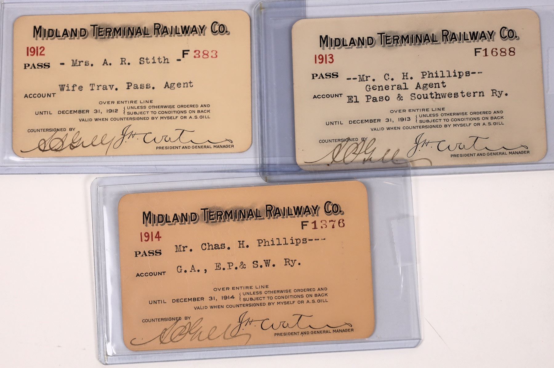 3 Consecutive Passes to Midland Terminal Railway Co. 1912, 1913, 1914. The 1912 pass is for the wife of passenger agent, Mr. Chas H. Phillips. Nice passes. Please see photos!