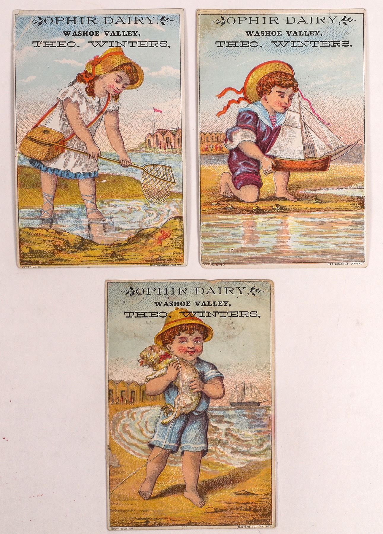 These three advertising pieces (2.5 x 4.5") feature a young child enjoying the beach. They were for the Ophir Dairy, Washoe Valley, Theo. Winters. Winters was an important person in the Washoe Valley and on the Comstock (mining). Winters, California is named for his family. Not only do these look nice, Ophir ephemera is not easy to come by.