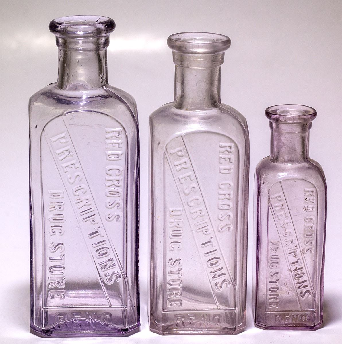 3.5", 4.5", 4.75" clear squares. RED CROSS / PRESCRIPTIONS / DRUG STORE / RENO// W. T. CO / U.S.A. No visible chips or cracks. Page 269 in Holabird, book example. Date: C. 1908-1920 Location: Reno, Nevada HWAC# 57927