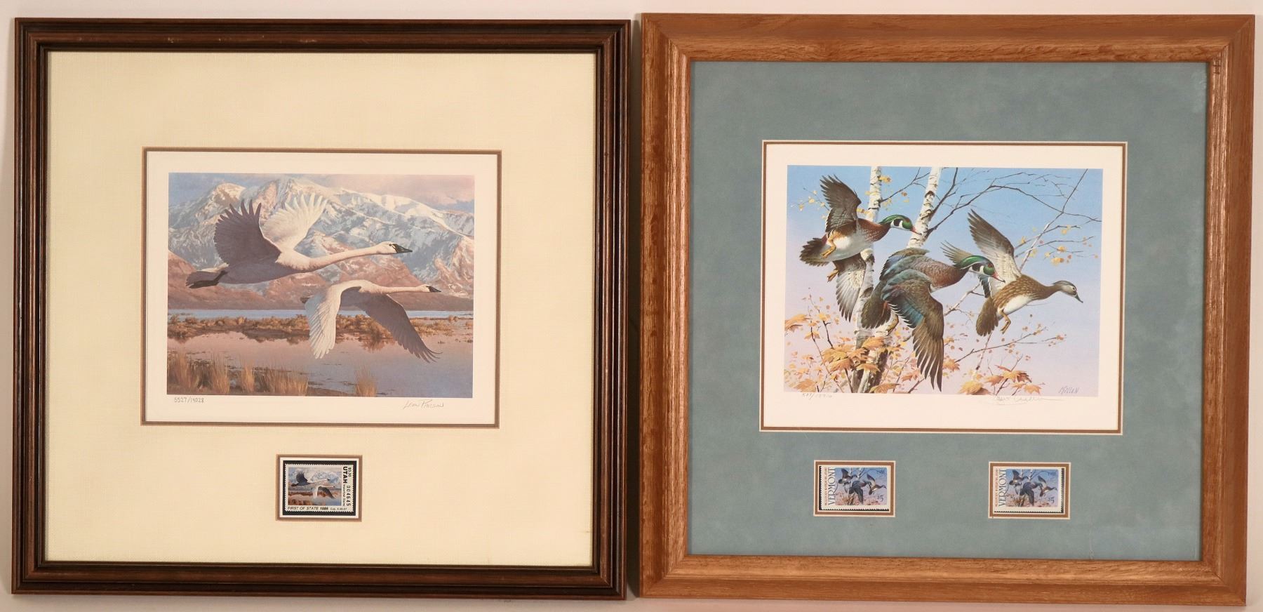 1) Migratory Waterfowl Vermont by James Killen--no.588/13910. Killenis an avid sportsman and internationally recognized wildlife and sporting dog artist. Framed: 17" x 17.5". 2) 1985 Wyoming Duck Stamp Ltd.Ed. no. 4318. Canada Geese by Robert Kusserow. Framed: 17" x 18". Frame has some damage and print has slipped downward in mat. 3) Utah waterfowl stamp of two snow geese n flight by Leon Parson. 1886 Utah Duck Stamp, no. 5527/14028. Leon claims that painting has never been easy for him--95% hard work and 5% talent! Framed: 17" x 18". All prints are double matted and framed nicely.