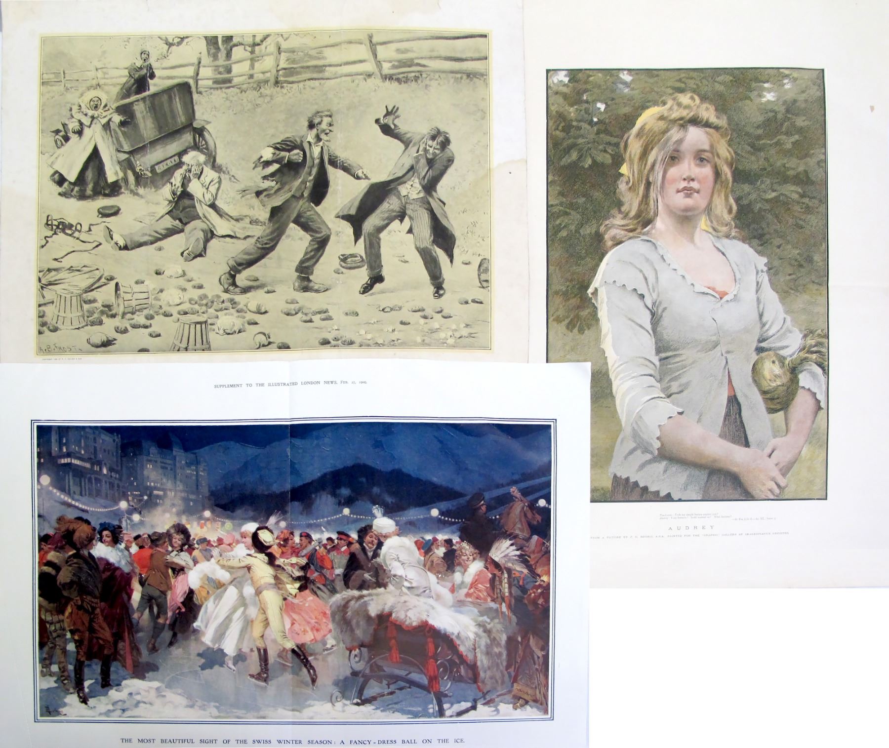 1906 print by AB Frost, printed by PF Collier and son of men fighting on a road near an early car-2 vertical folds, creases, toning, approx 16 x 20". Female Audrey by PR Morris-horizontal crease, approx 22 x 16". Supplement to the Illustrated London News, Feb 27, 1909, a fancy Swiss ball on ice, approx 16 x 22", 3 creases. City: State: Date: