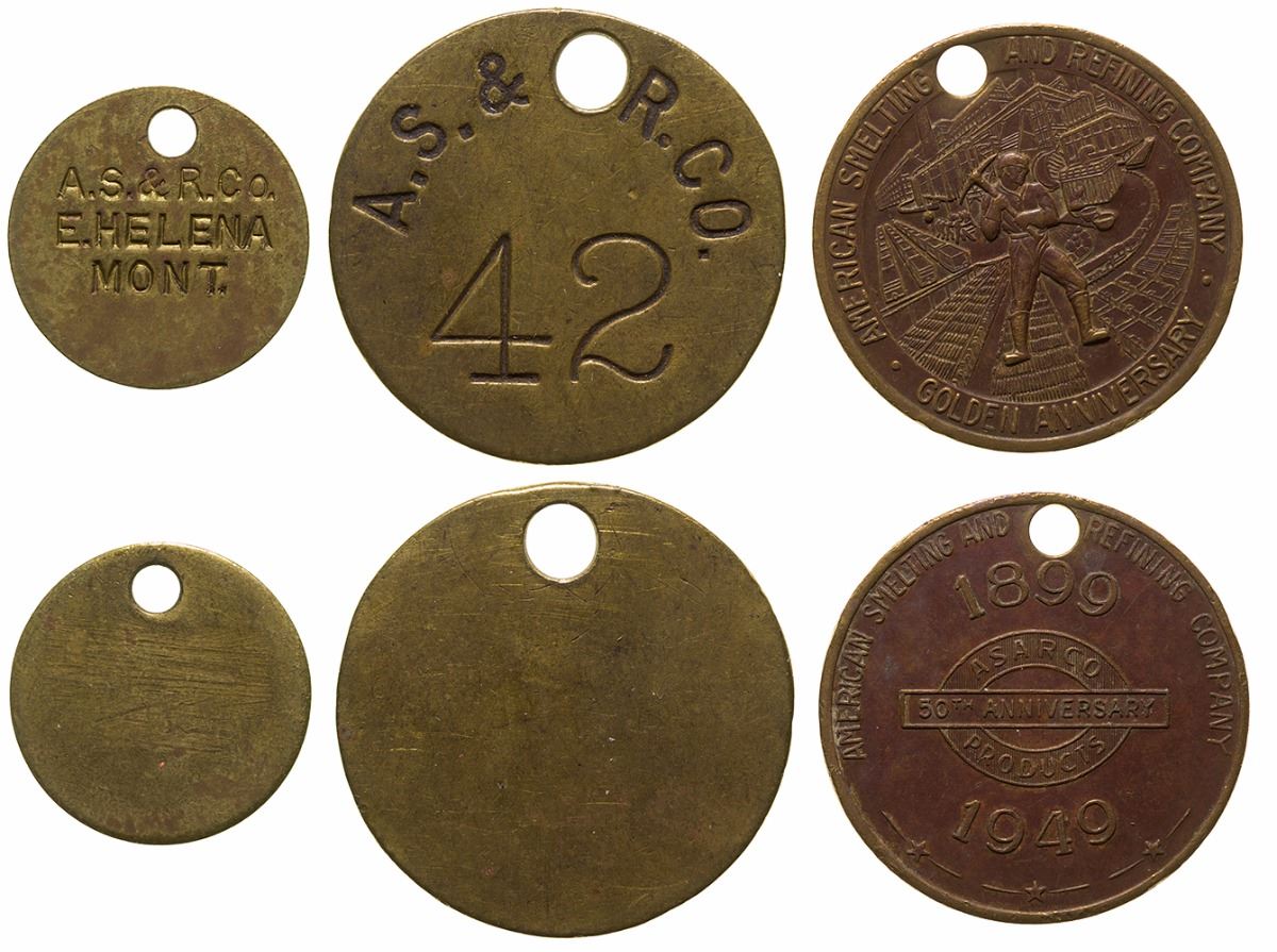 1) ASARCO, Anaconda Smelting, brass, hole at top; 2) American Smelting & Refining Co., "42" , brass, hole at top; 3) American Smelting & Refining Co. Golden Anniversary, 1899-1949, brass, hole at top. State: Montana City: East Helena Date: FHWAC#: 41607