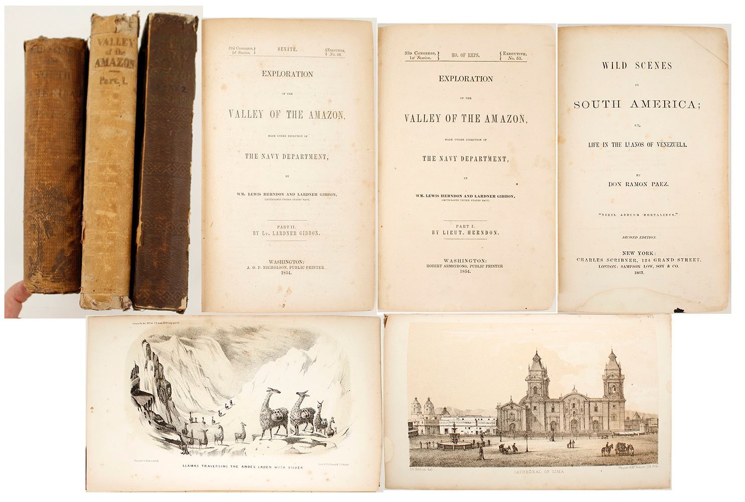 1) "Wild Scenes in South America" by Don Ramon Paez, 2nd edition, 1863. Hardbound, cloth cover, 8.5" x 5.5". 2) Part One by Lieut. Herndon. "Exploration of the Valley of the Amazon", made under direction of The Navy Department, by Wm. Lewis Herndon and Lardner gibbon, Lieutenants, US Navy. Published 1854. Incredible illustrations. Hardbound cover, cloth, 9" x 6". 3) Part Two by Lieut. Lardner Gibbon. "Exploration of the Valley of the Amazon", made under direction of The Navy Department, by Wm. Lewis Herndon and Lardner gibbon, Lieutenants, US Navy. Published 1854. Incredible illustrations. Hardbound cover, cloth, 9" x 6". Date: Location: zSouth America HWAC# 39673