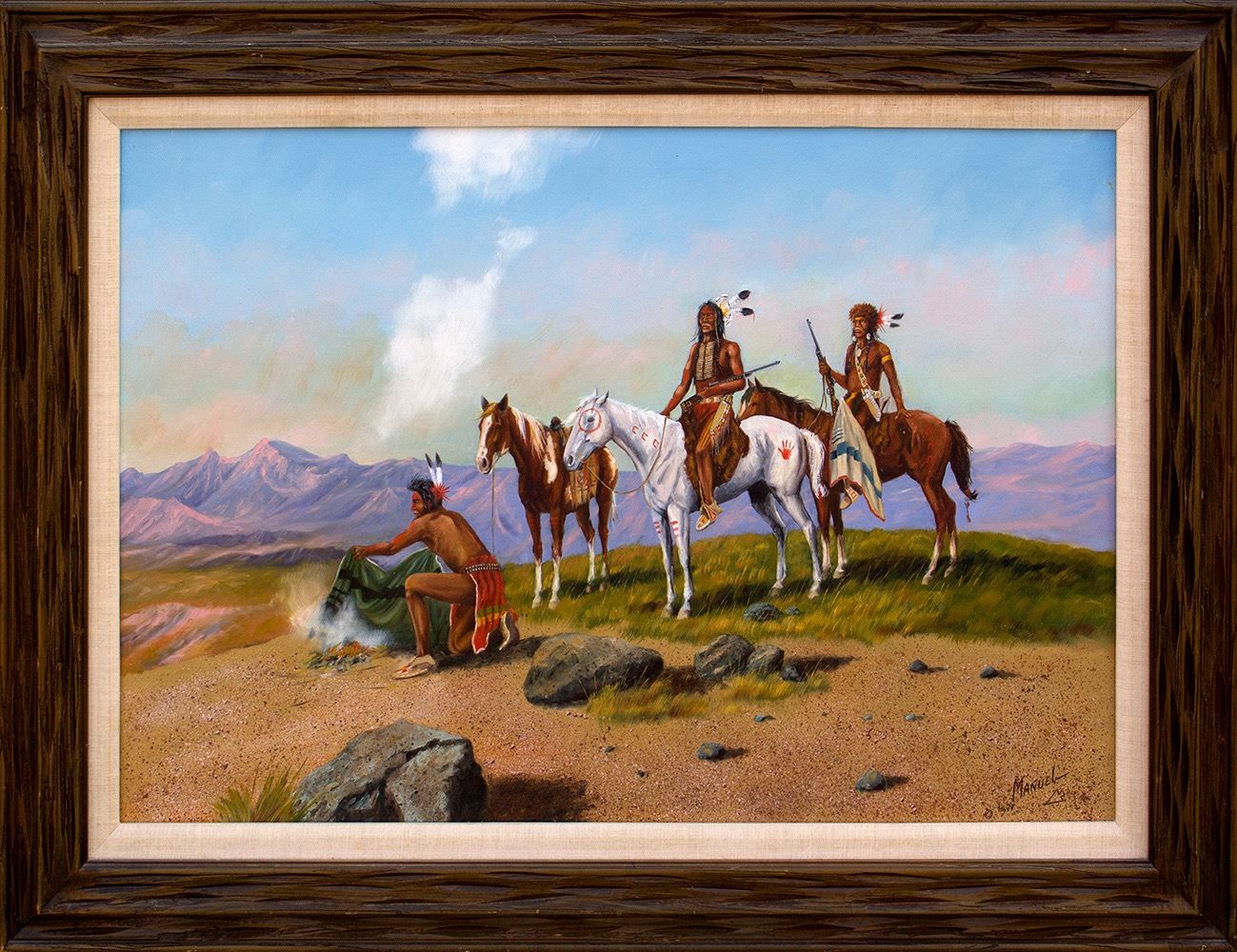 "3 Indians" by Joseph Manuel. Oil painting, 24" x 36", framed 32.5" x 44.5". State: City: Date: ID# 49734