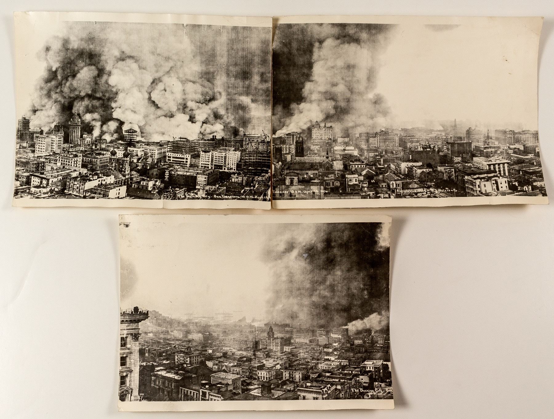3 Parts of a panorama taken after the 1906 earthquake in San Francisco. Shows fires, smoke and damage to the city in the wake of the earthquake. Titled "The Burning City". Each section is approximately 10" x 13". State: California City: San Francisco HWAC#: 40405 Date: