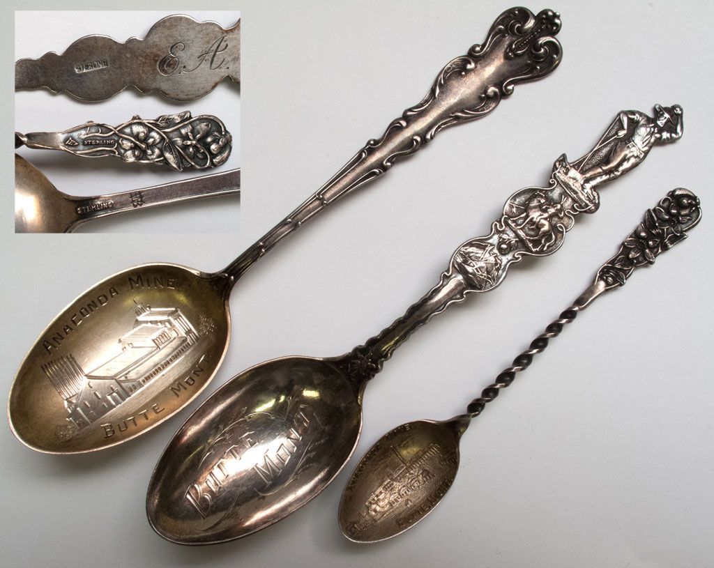 All have mining scene in bowl. All sterling silver. One has initials E. A. engraved on reverse. All different. Date 1909 Butte, MT hwac 8828